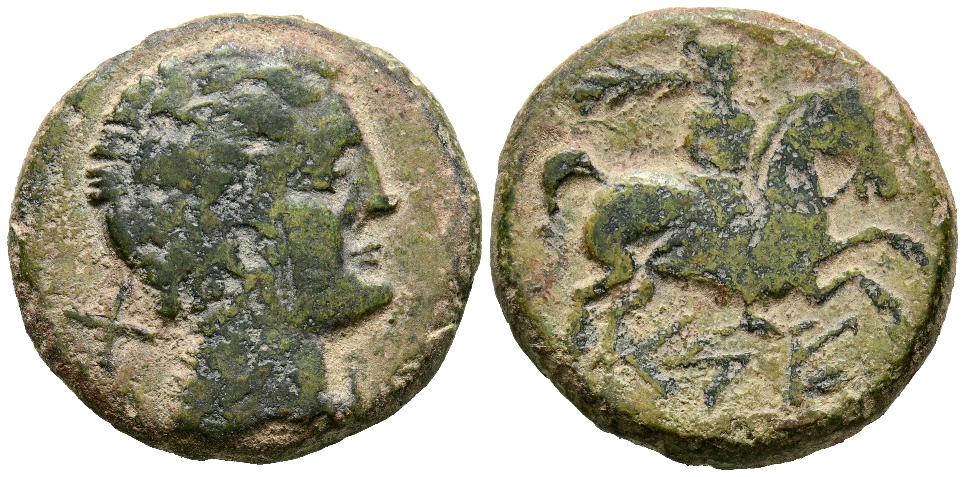 CESE (Tarragona). As. (Ae. 8,46g/23mm). 120-20 a.C. (FAB-2289). Anv: Cabeza masculina a derecha, detrás letra ibérica: Ta. Rev: Jinete con palma a derecha, debajo leyenda ibérica: CeSE. MBC-.