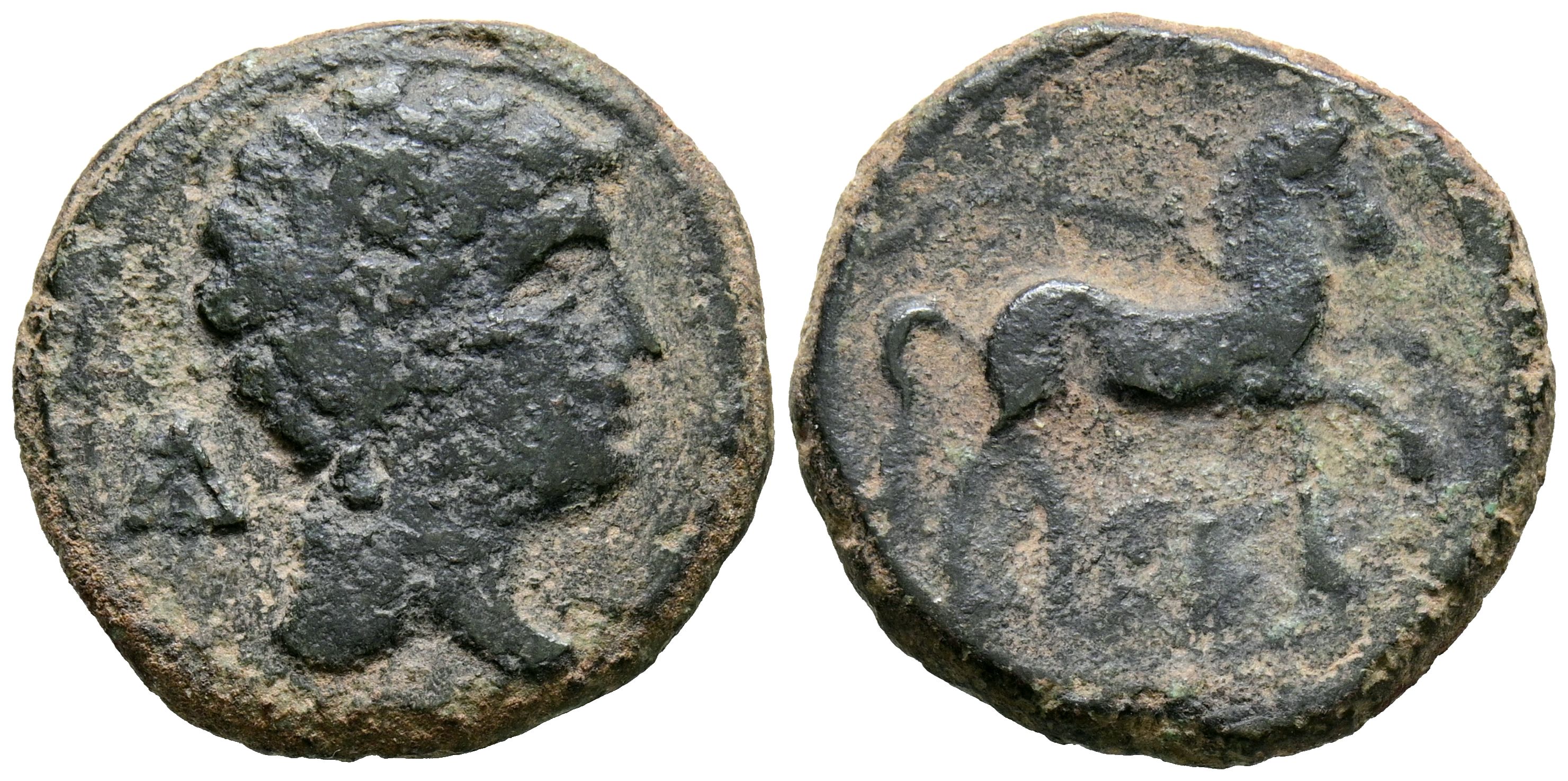 CESE (Tarragona). Semis. (Ae. 5,29g/21mm). 120-20 a.C. (FAB-2317). Anv: Cabeza masculina a derecha, detrás letra Du. Rev: Caballo a derecha al trote, entre sus patas leyenda ibérica: CeSE. MBC-.