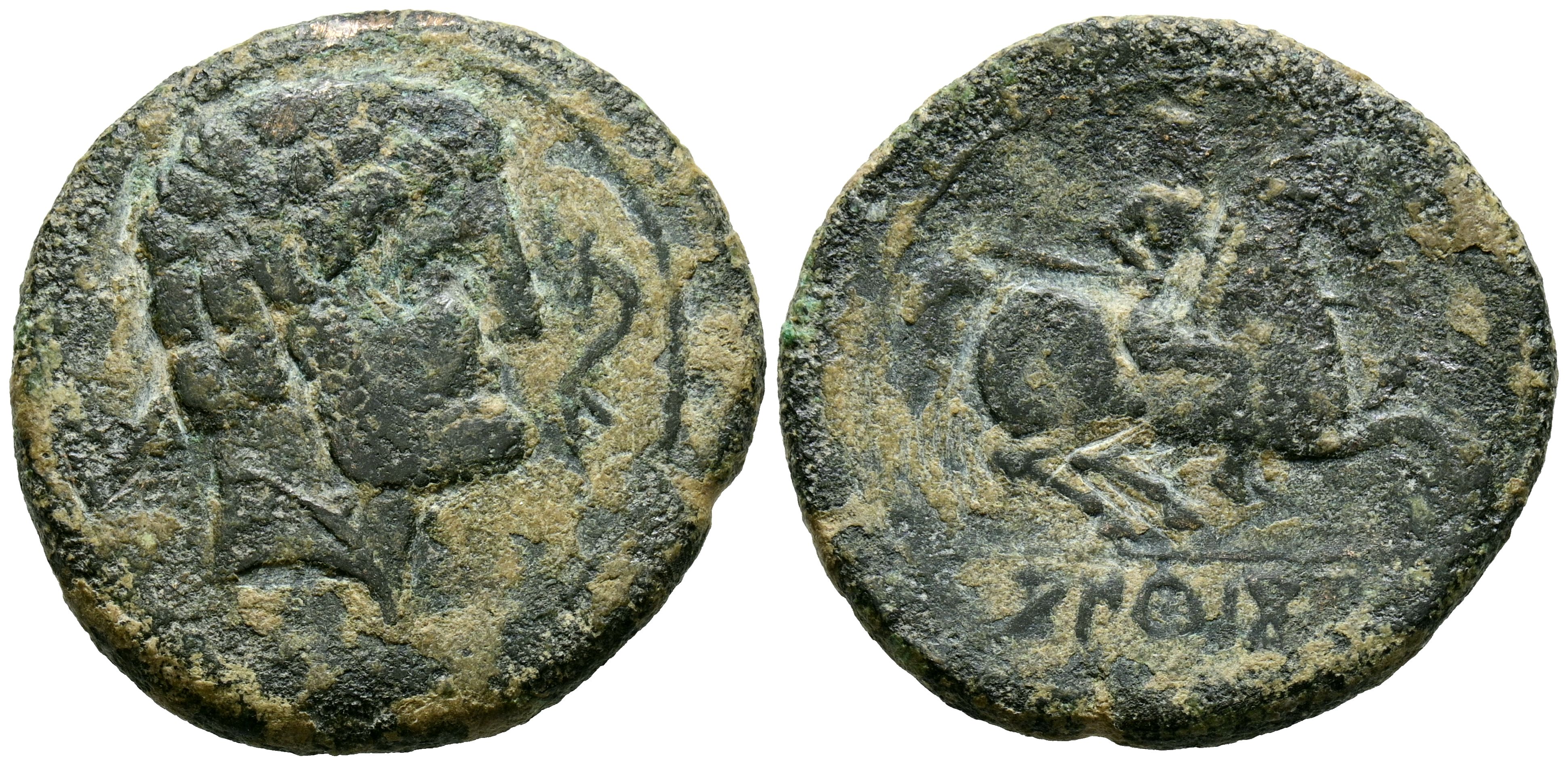 CONTERBIA CARBICA (Huete, Cuenca). As. (Ae. 11,19g/27mm). 120-80 a.C. (FAB-850). Anv: Busto masculino a derecha con barba, delante delfín, detrás letra ibérica: Co. Rev: Jinete con lanza a derecha, leyenda ibérica bajo línea: CoNTeBaCoM. MBC-.