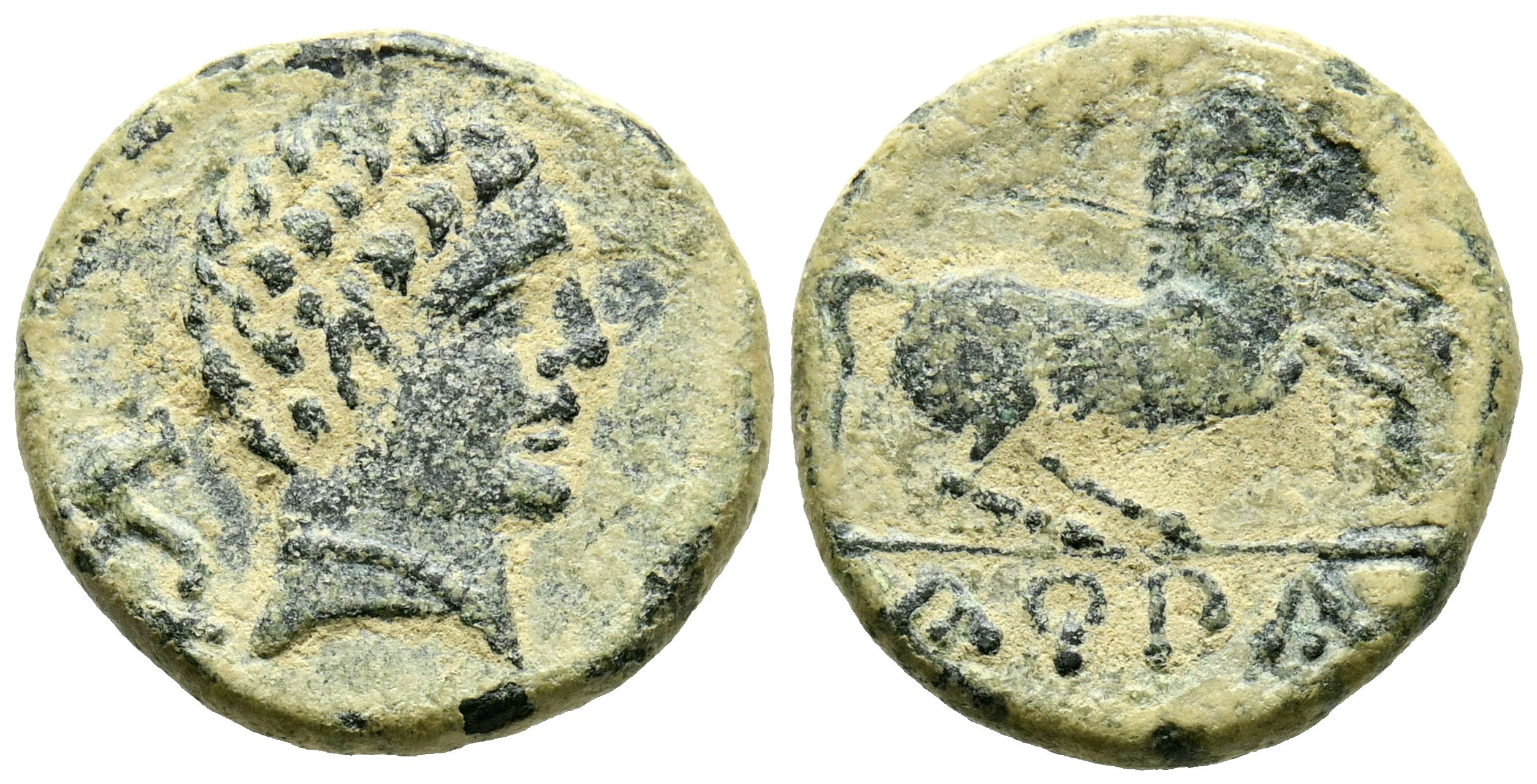 CONTERBIA CARBICA (Huete, Cuenca). Semis. (Ae. 3,97g/18mm). 120-80 a.C. (FAB-855). Anv: Cabeza masculina a derecha, detrás delfín. Rev: Caballo saltando a derecha, debajo leyenda ibérica: CaRBiCa. MBC.