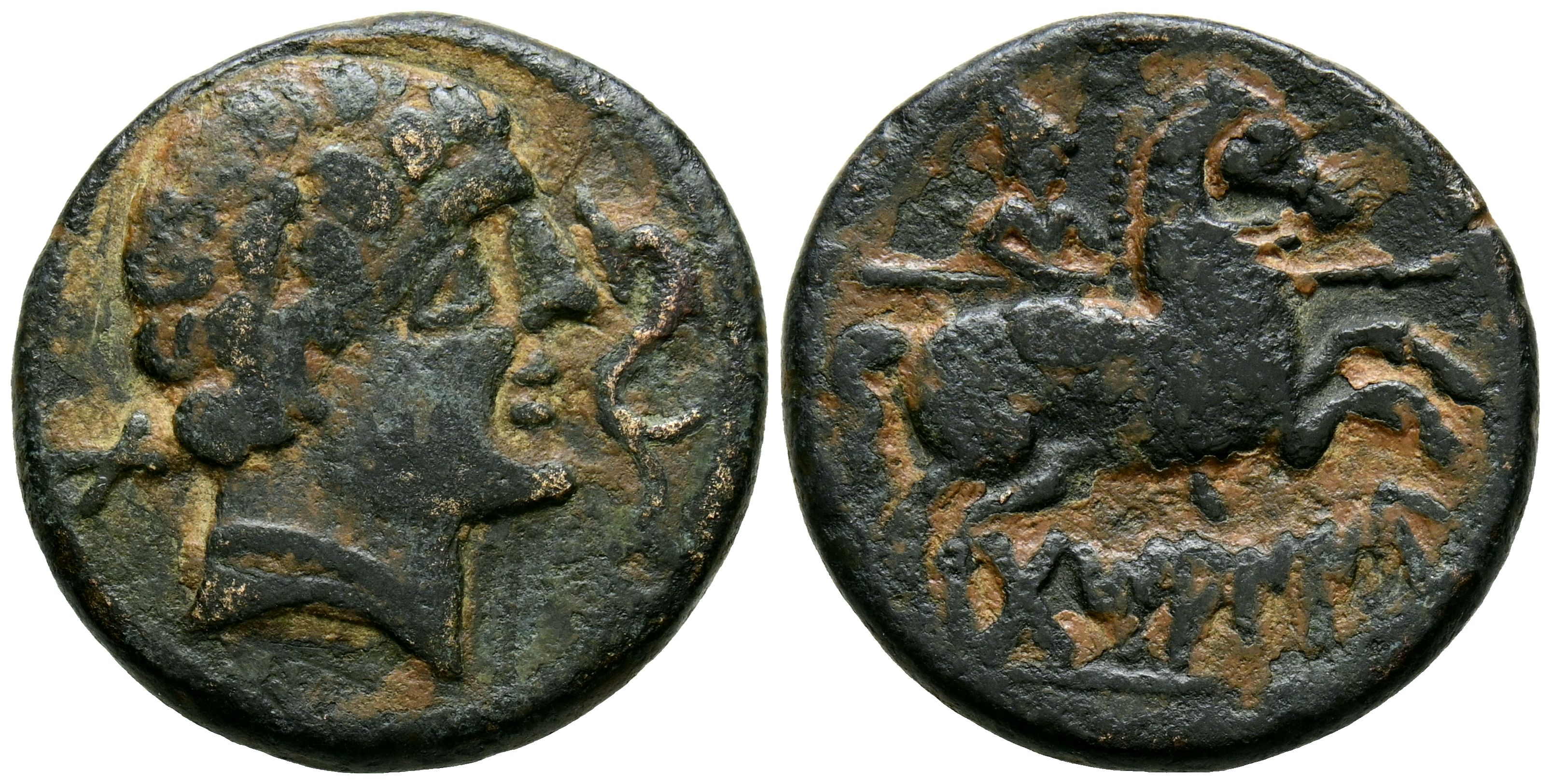 DAMANIU (Zona de Aragón). As. (Ae. 7,04g/22mm). 120-20 a.C. (FAB-890). Anv: Cabeza masculina a derecha, detrás X, delante delfín. Rev: Jinete con lanza a derecha, detrás leyenda ibérica: DaMANIU. MBC. Escaso.