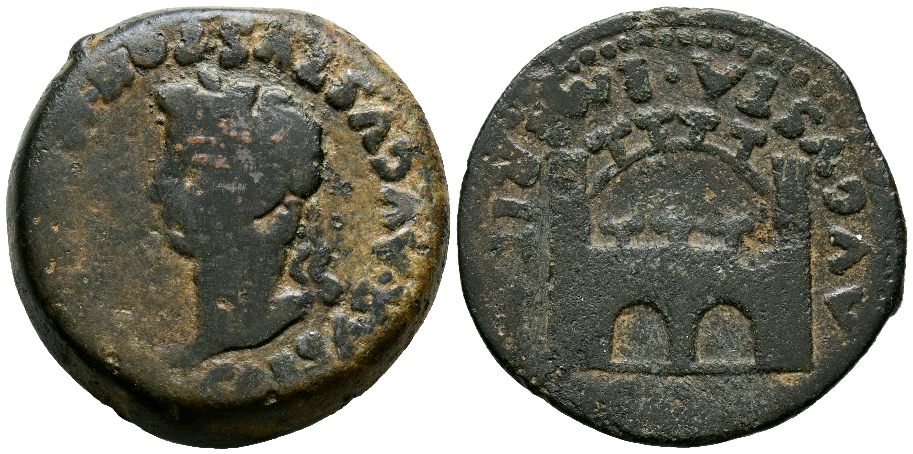 EMERITA AUGUSTA (Mérida, Badajoz). As. (Ae. 10,84g/26mm). 14-36 d.C. (FAB-1056). Anv: Cabeza laureada de Augusto a izquierda, alrededor leyenda: TI CAESAR AVGVSTVS PON MAX IMP. Rev: Puerta de la ciudad, alrededor leyenda: COL AVGVSTA EMERITA. MBC-.