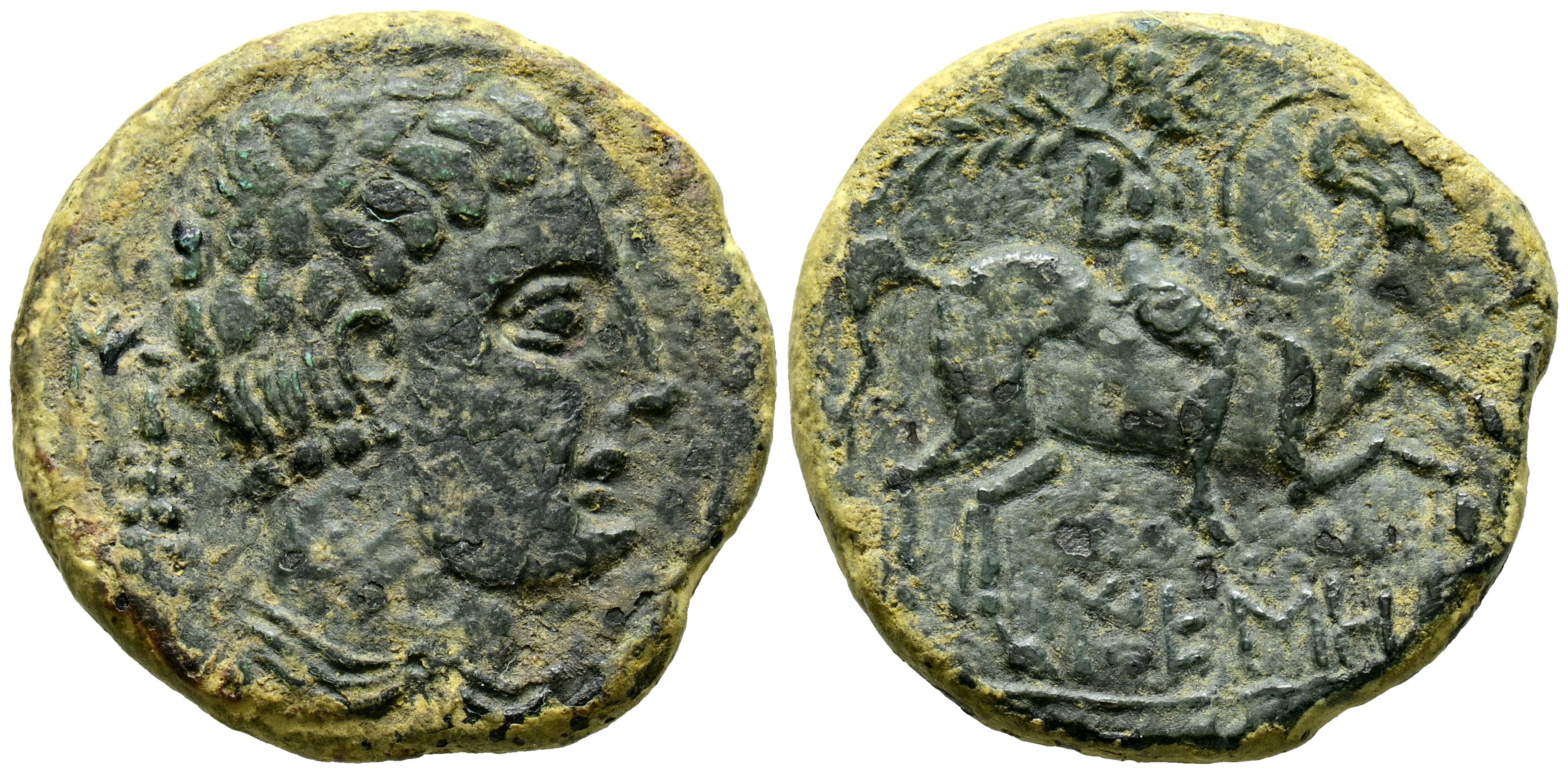 IESO (Guisona, Lérida). As. (Ae. 13,51g/26mm). 120-20 a.C. (FAB-1422). Anv: Cabeza masculina a derecha, detrás letra ibérica N y clava. Rev: Jinete con palma a derecha, debajo leyenda ibérica: IESO. MBC. Raro ejemplar.