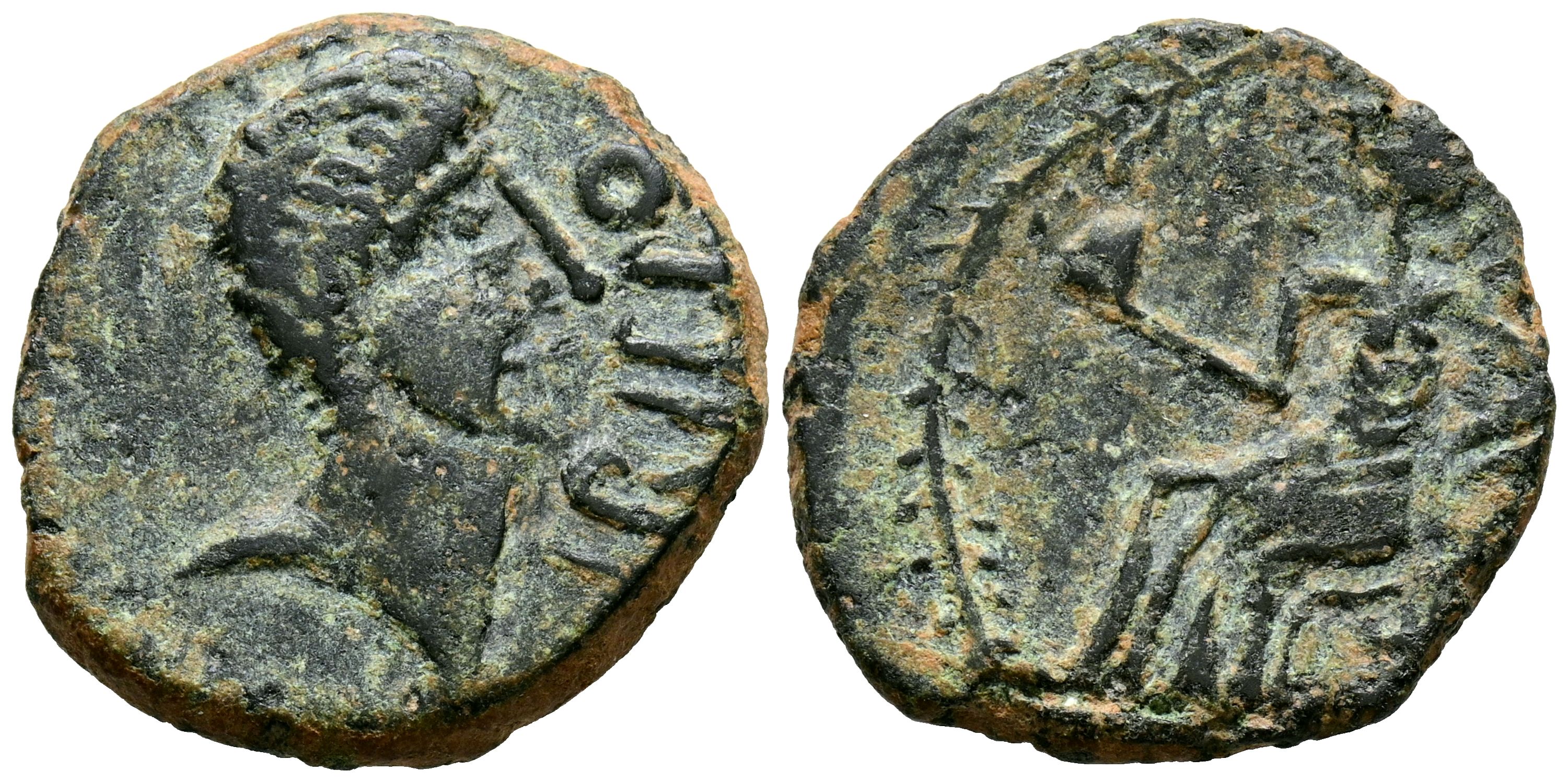 IRIPPO (Zona sur de Sevilla). Semis. (Ae. 4,95g/22mm). 30 a.C. (FAB-1581). Anv: Cabeza masculina a derecha, delante: IRIPPO. Rev: Figura femenina sentada a izquierda con piña y cornucopia. MBC.