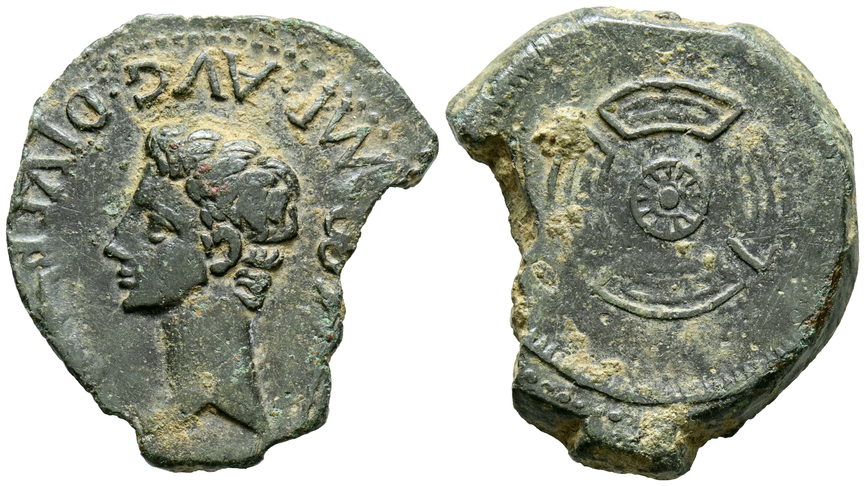 LUCO AUGUSTI (Lugo). As. (Ae. 7,37g/26mm). 27 a.C.-14 d.C. (FAB-1706). Anv: Cabeza desnuda de Augusto a izquierda, detrás caduceo, delante palma, alrededor leyenda: IMP AVG DIVI F. Rev: Rodela de frente sin reborde. MBC-. Cospel faltado.