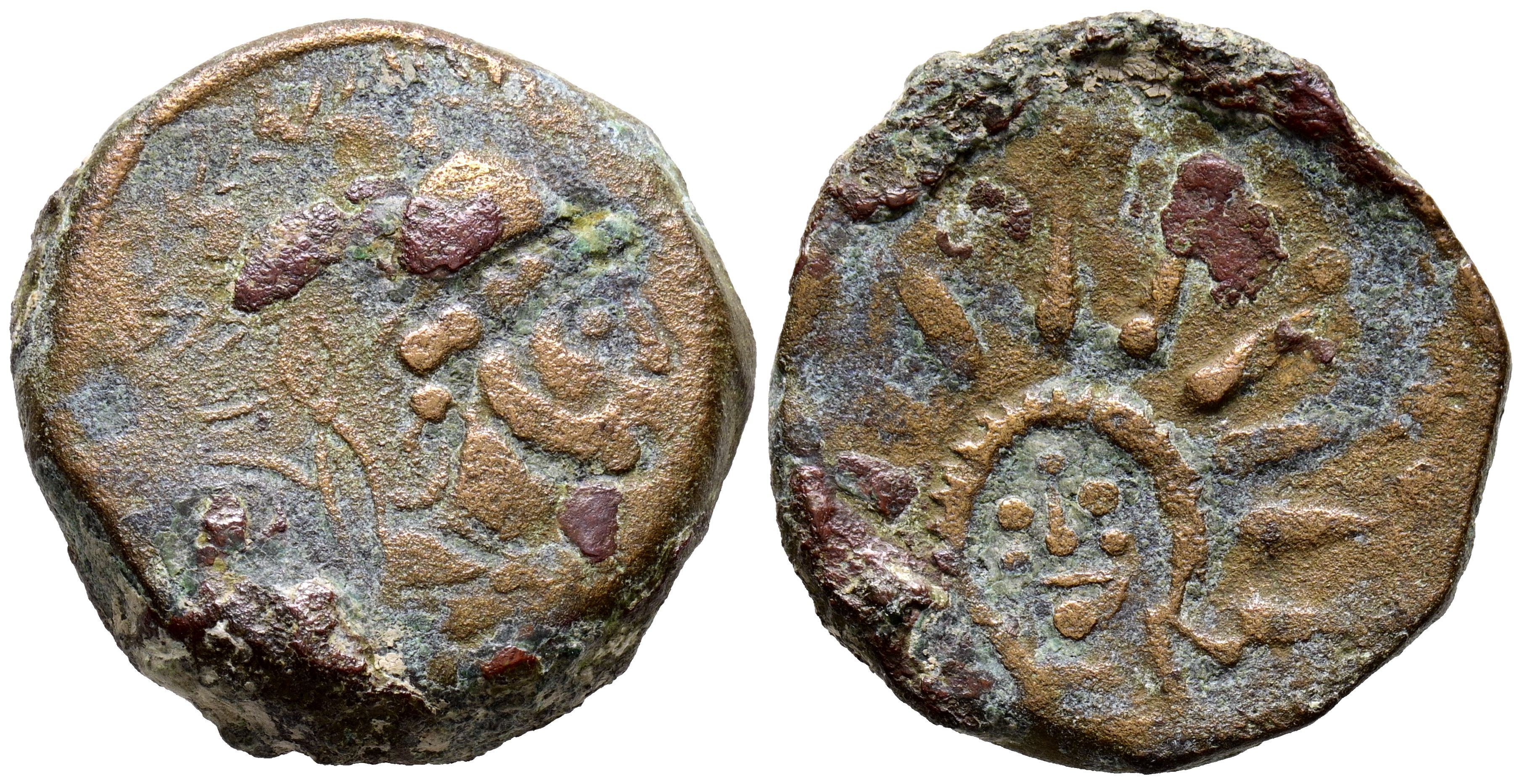 MALACA (Málaga). As. (Ae. 14,24g/26mm). 200-20 a.C. (FAB-1727). Anv: Cabeza de Vulcano a derecha, detrás tenazas y leyenda púnica tipo A. Rev: Cabeza de Helios de frente. MBC-. Limpiada.
