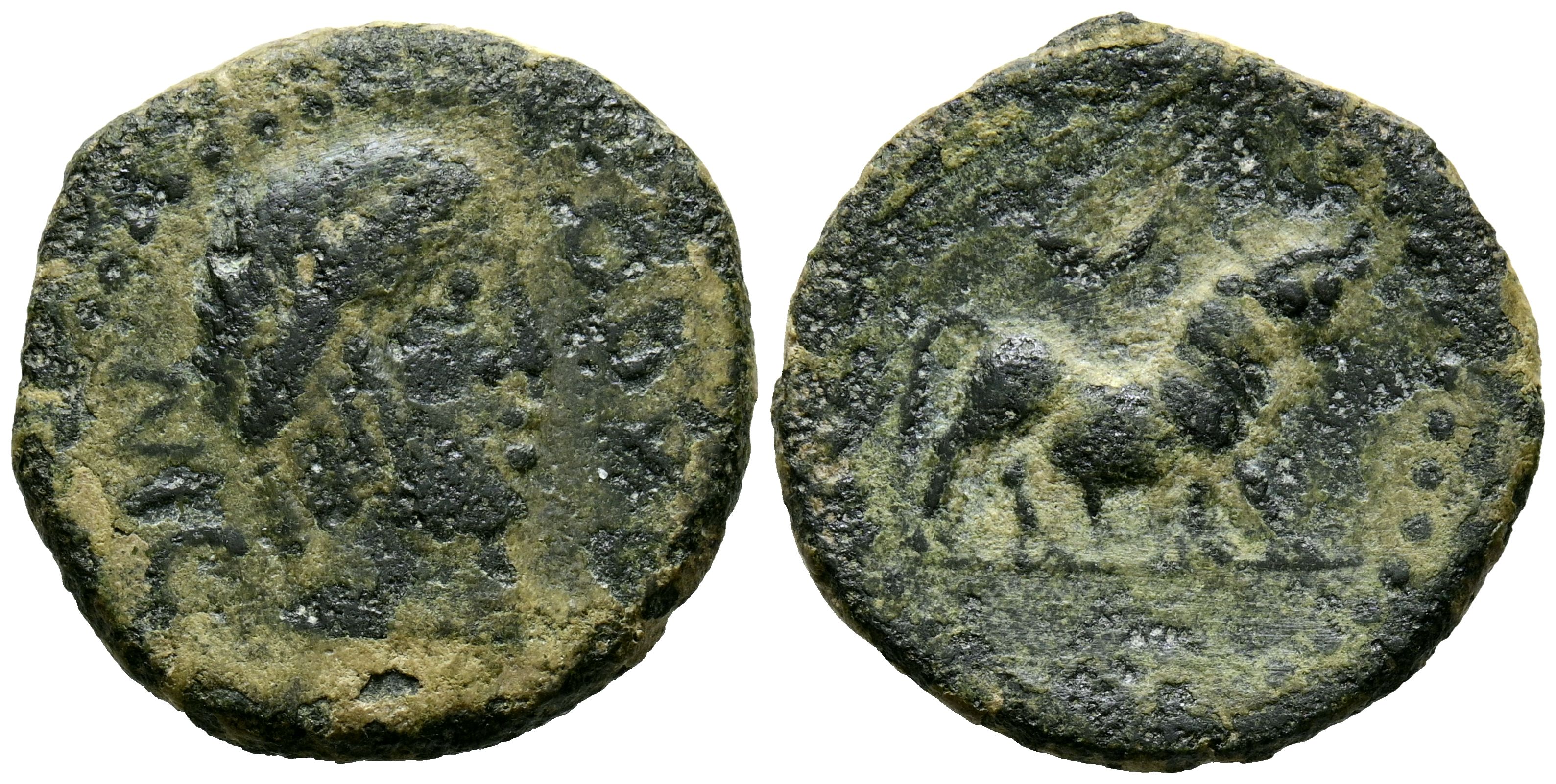 OBULCO (Porcuna Jaén). Semis. (Ae. 5,54g/22mm). 220-20 a.C. (FAB-1832). Anv: Cabeza femenina a derecha, alrededor leyenda: NIG OBVL. Rev: Toro a derecha, encima creciente. MBC-.