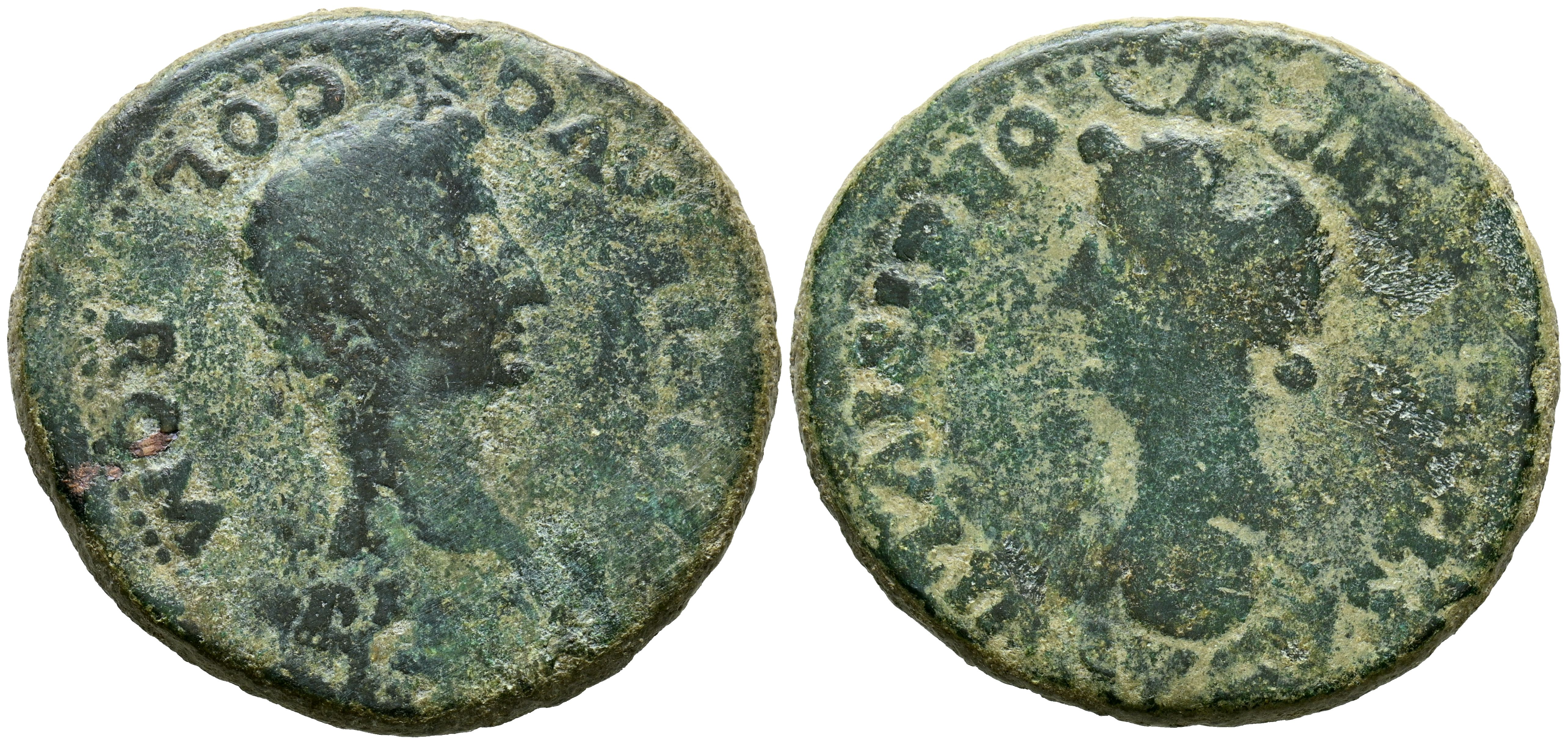 COLONIA ROMULA. Dupondio. (Ar. 24,27g/36mm). 14-36 a.C. Sevilla. (FAB-2014). Anv: Cabeza radiada de Augusto a derecha, delante fúlmen, alrededor leyenda: PERM DIVI AVG COL ROM. Rev: Cabeza de Livia, debajo globo, encima creciente, alrededor leyenda: IVLIA AVGVSTA GENETRIX ORBIS. MBC-.