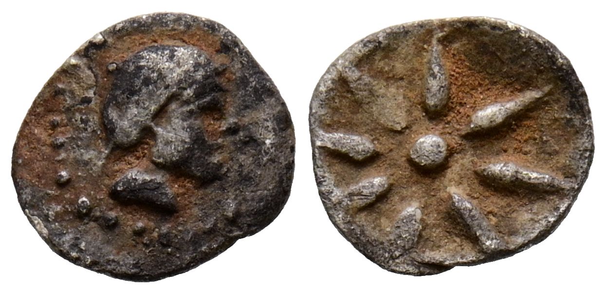 ARSE-SAGUNTO (Sagunto, Valencia). Obolo. (Ar. 0,23g/9mm). 300-200 a.C. (RAS 57). Anv: Cabeza femenina a derecha con pelo recogido. Rev: Estrella de ocho rayos. MBC. Raro ejemplar.