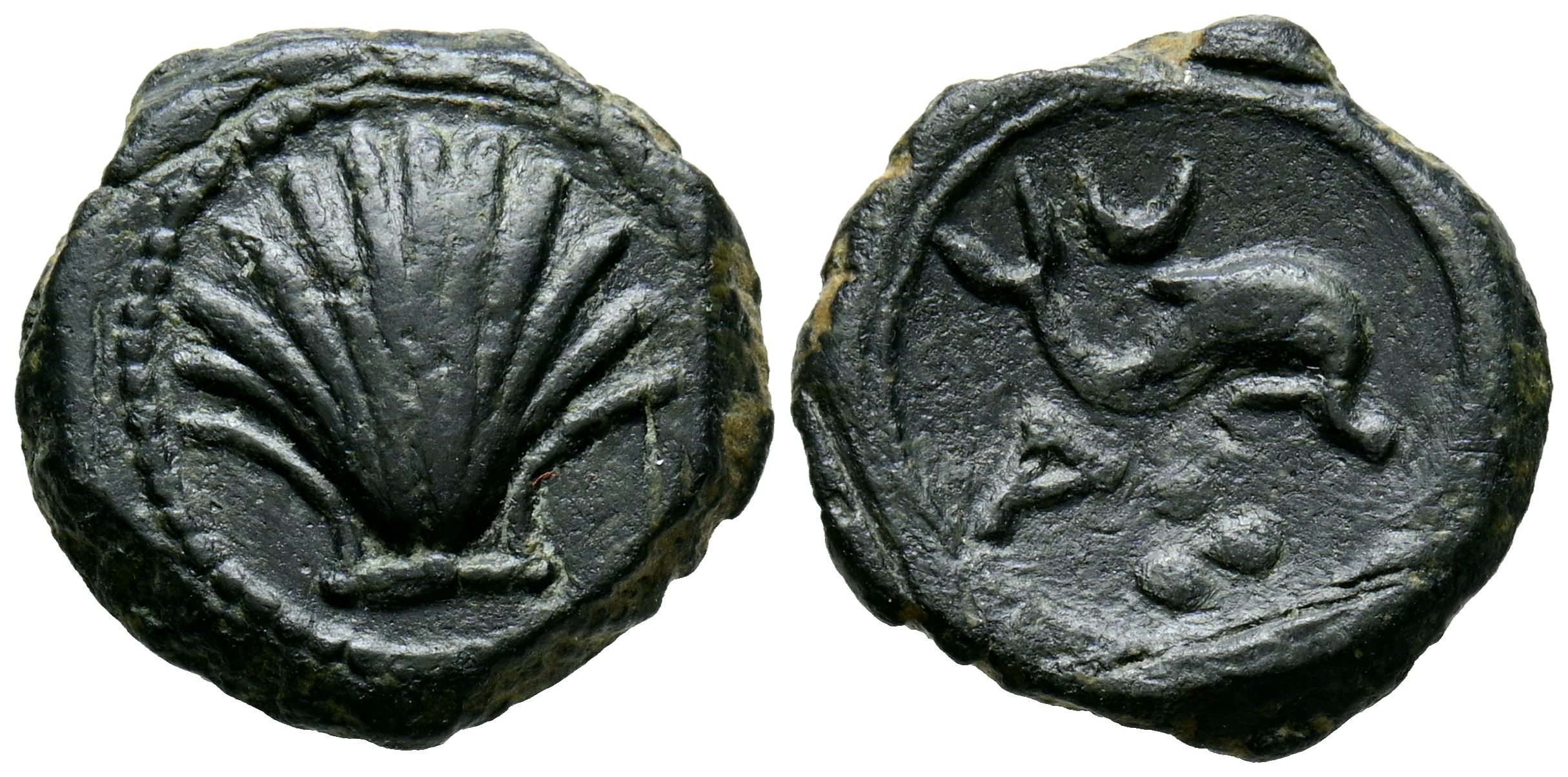ARSE-SAGUNTO (Sagunto, Valencia). Cuadrante. (Ae. 3,74g/17mm). 170-20 a.C. (FAB-2054). Anv: Concha. Rev: Delfín, encima creciente, debajo letra iberica A y tres puntos. MBC+.