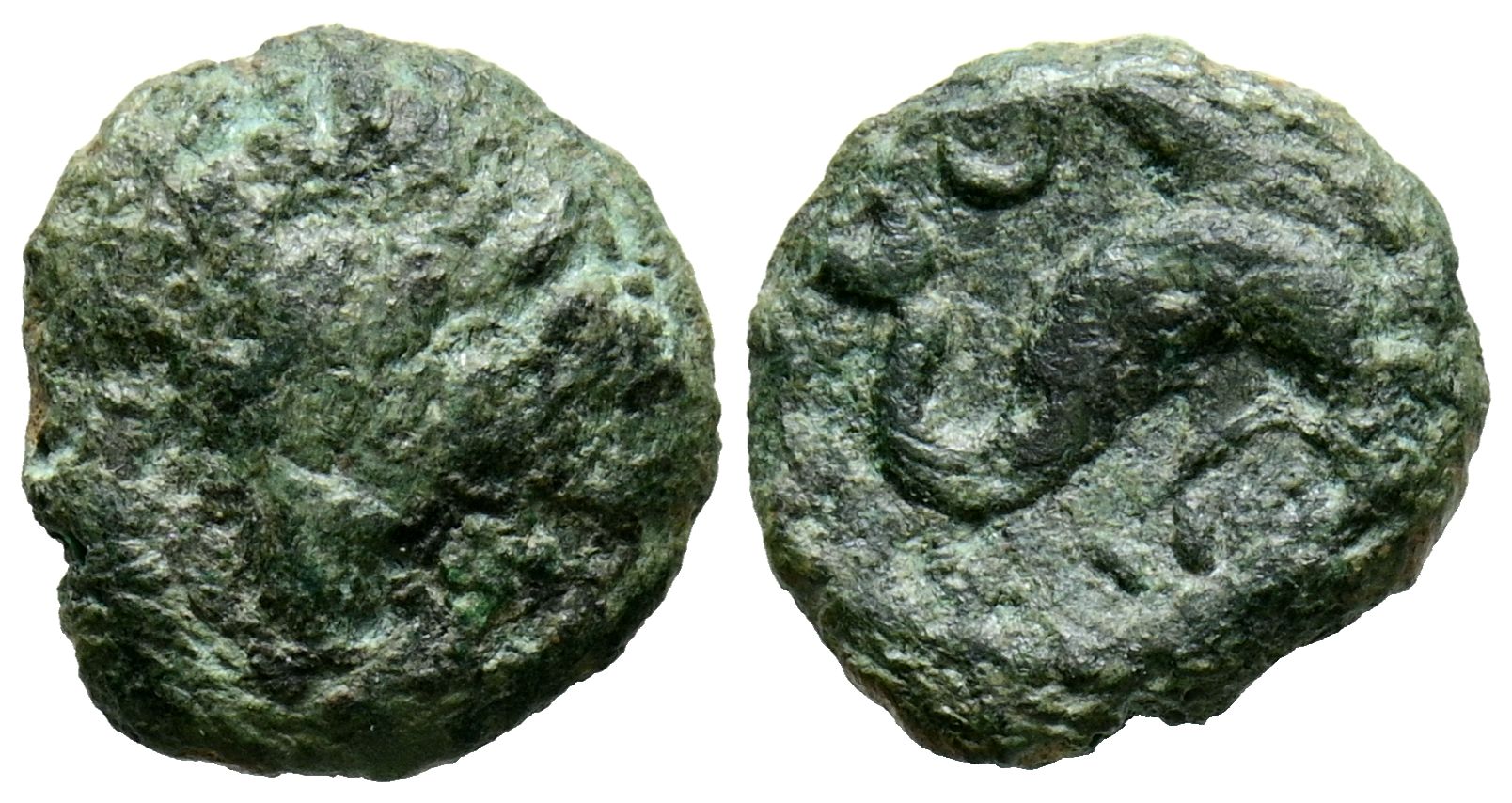 ARSE-SAGUNTO (Sagunto, Valencia). Sextante. (Ae. 1,17g/11mm). 170-20 a.C. (FAB-2064). Anv: Concha. Rev: Delfín a derecha, encima creciente, debajo letra ibérica A y estrella. MBC.