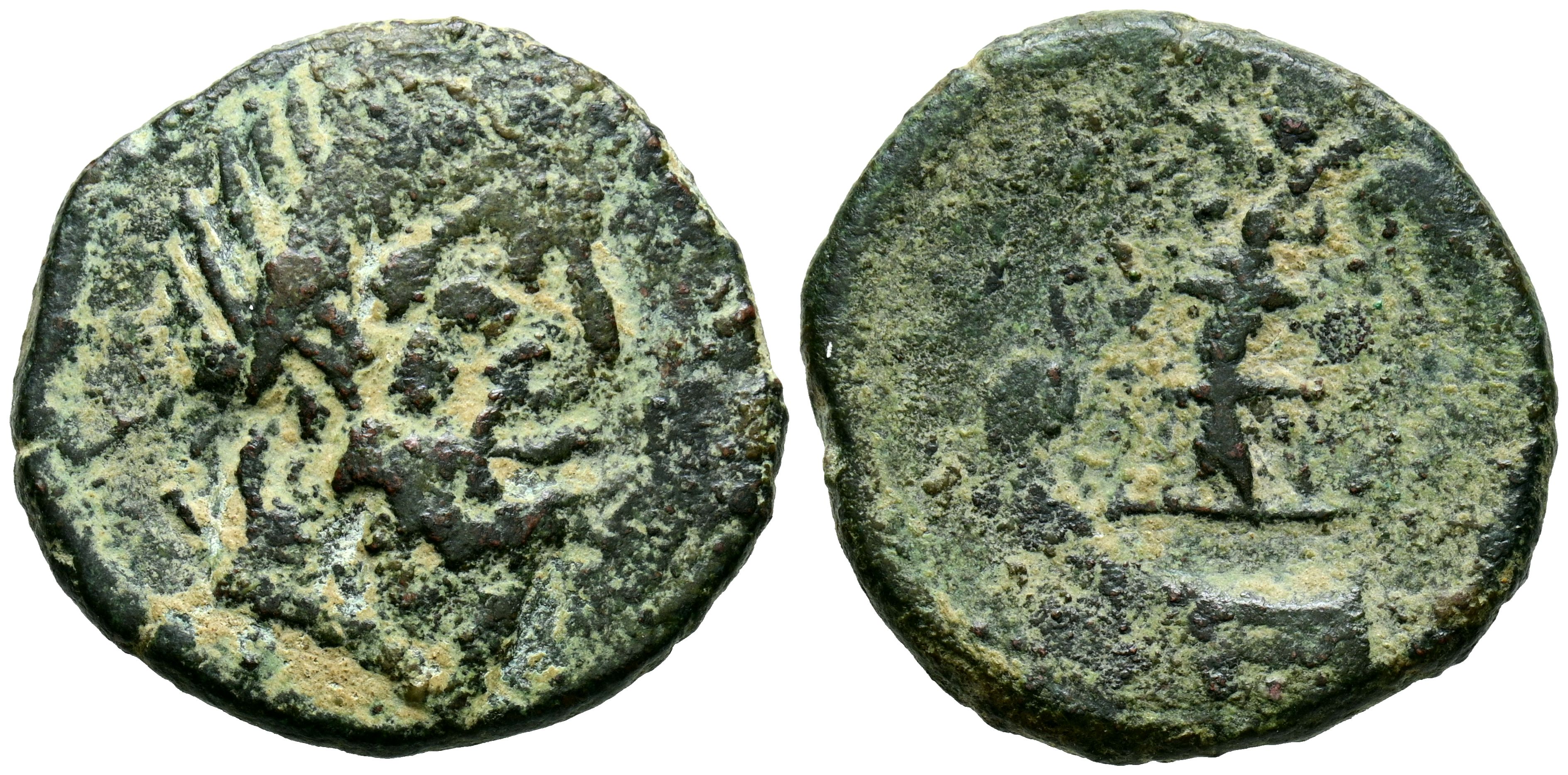 ARSE-SAGUNTO (Sagunto, Valencia). As. 150-100 a.C. (FAB-2074; ACIP 2074). Anv: Cabeza de Neptuno laureado a derecha, detrás tridente. Rev: Victoria con corona y palma sobre proa a izquierda. BC+/BC. Muy rara.