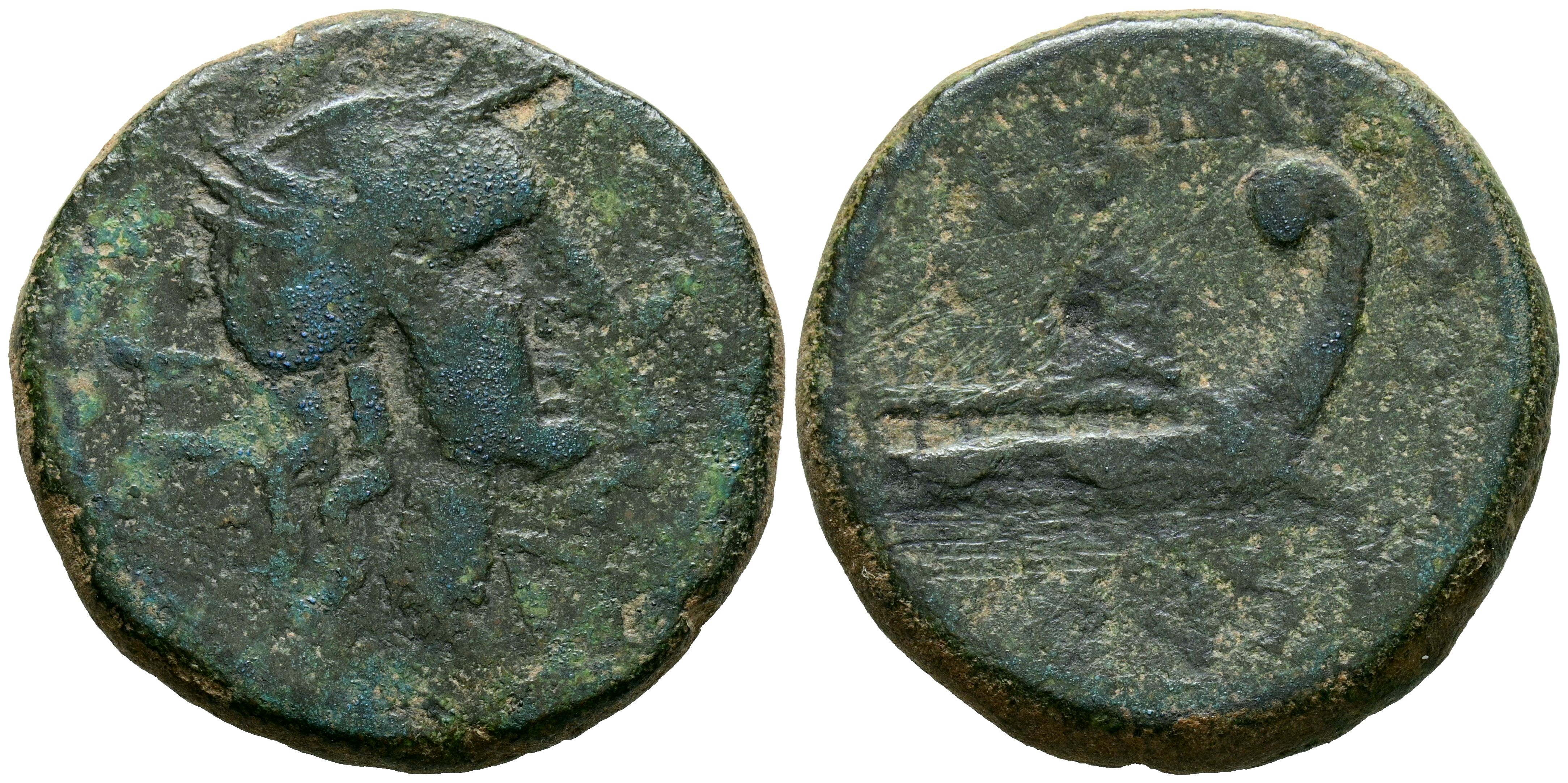 ARSE-SAGUNTO (Sagunto, Valencia). As. (Ae. 20,74g/30mm). 50-20 a.C. (FAB-2083). Anv: Cabeza de Roma a derecha, alrededor leyenda: SAGVNTINI. Rev: Proa a derecha, delante caduceo, debajo leyenda: ARSE, encima: LBMP. BC+
