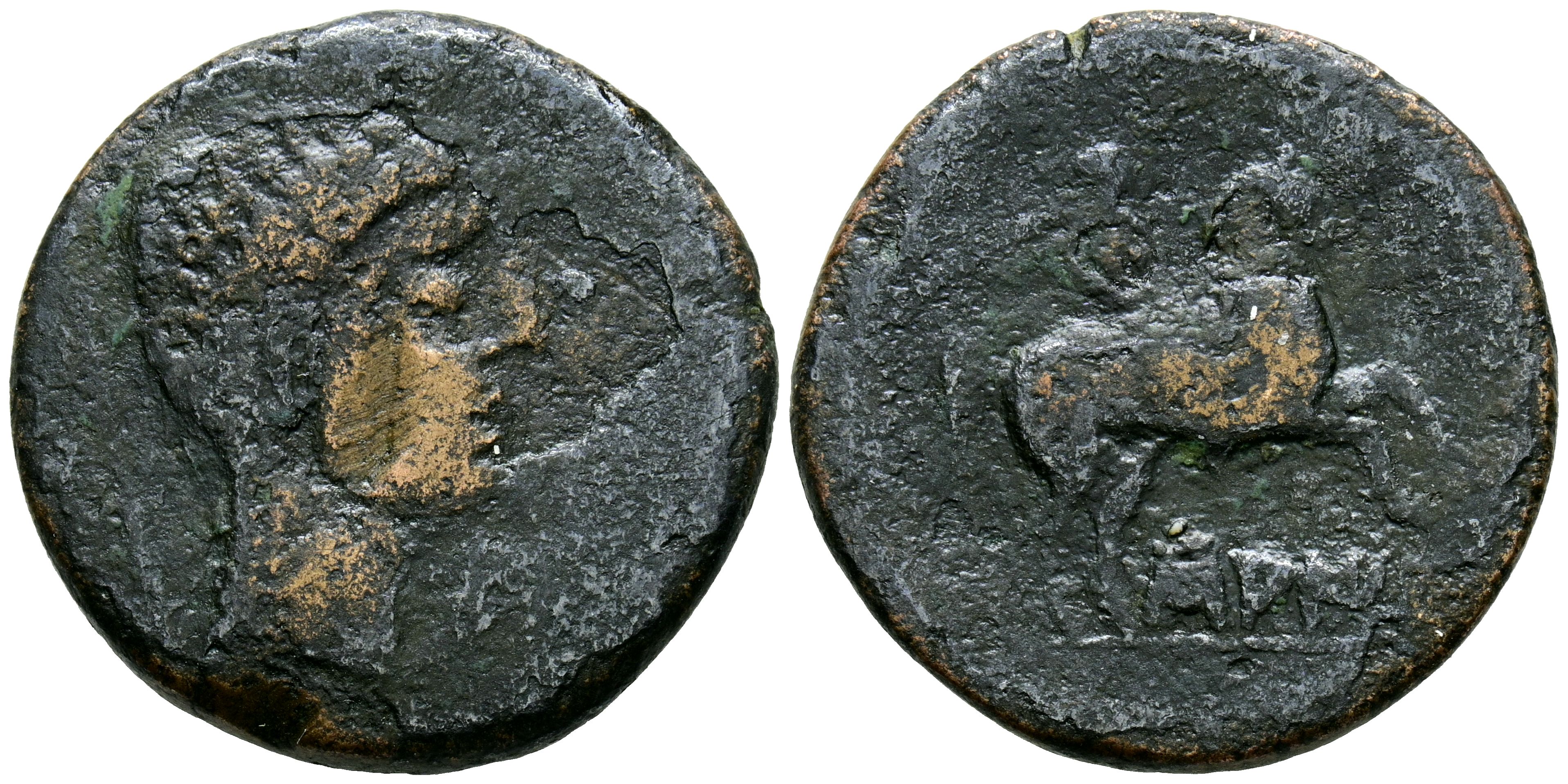 SAITI (Xátiva, Valencia). As. (Ae. 10,41g/27mm). 120-20 a.C. (FAB-2099). Anv: Cabeza masculina diademada a derecha, detrás palma. Rev: Jinete con lanza a derecha, debajo leyenda ibérica: SAITi. BC+.