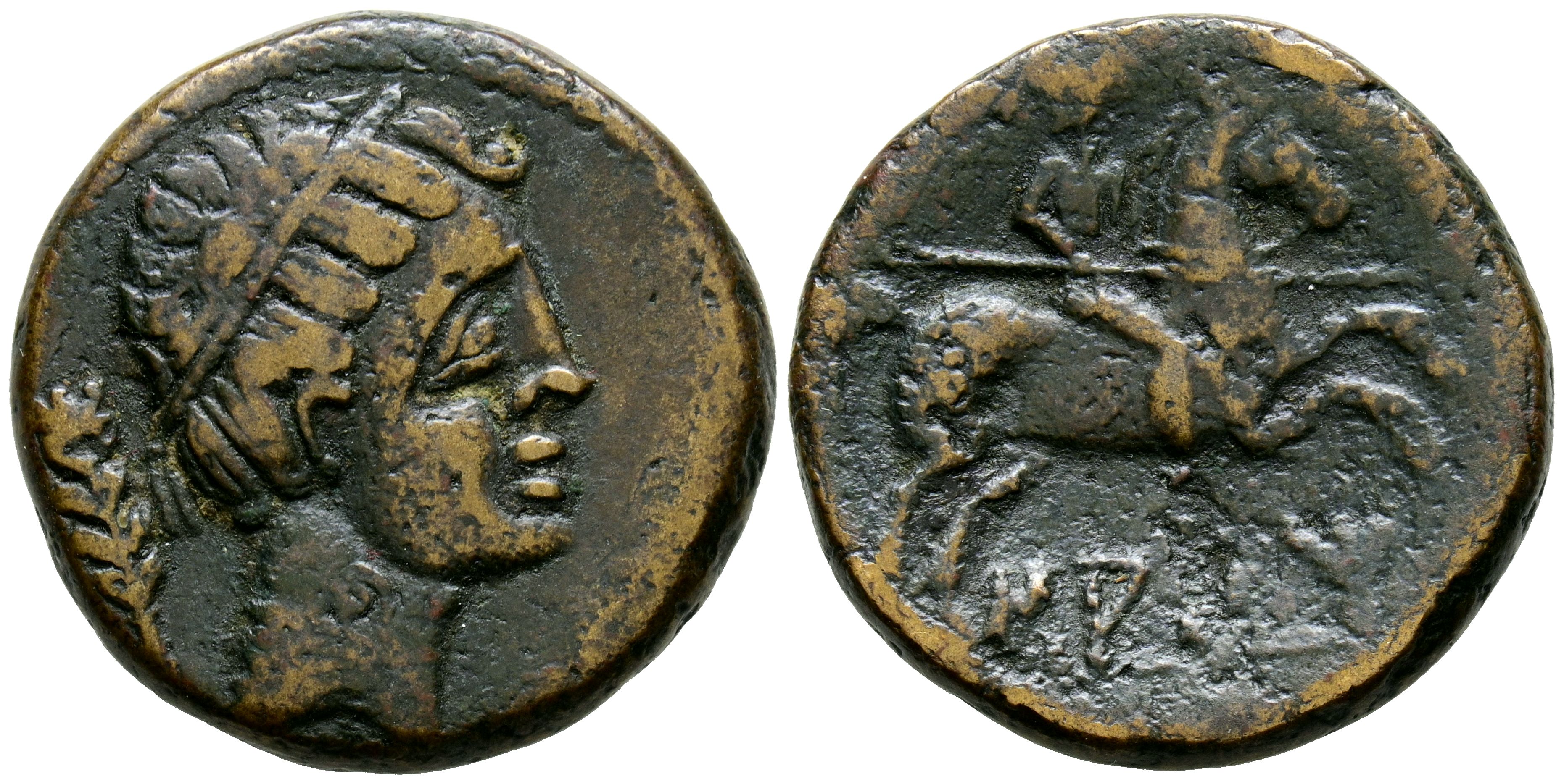 SAITI (Xátiva, Valencia). As. (Ae. 12,31g/26mm). 120-20 a.C. (FAB-2100). Anv: Cabeza masculina diademada a derecha, detrás palma. Rev: Jinete con lanza a derecha, debajo leyenda ibérica: SAITi. MBC.