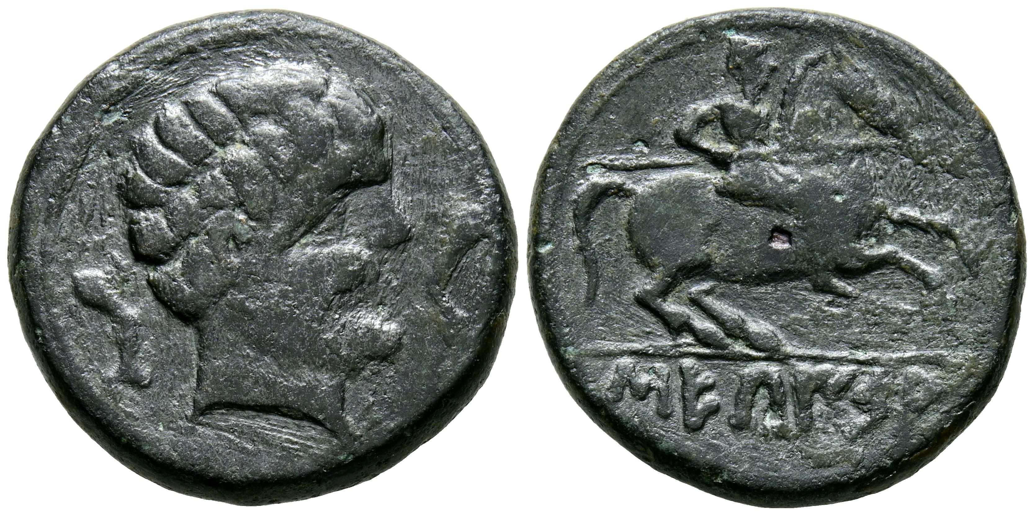 SECAISA (Segeda, Zaragoza). As. (Ae. 8,69g/23mm). 120-20 a.C. (FAB-2131). Anv: Cabeza masculina a derecha, entre dos delfines. Rev: Jinete con lanza a derecha, debajo leyenda ibérica: SECaISA. MBC.