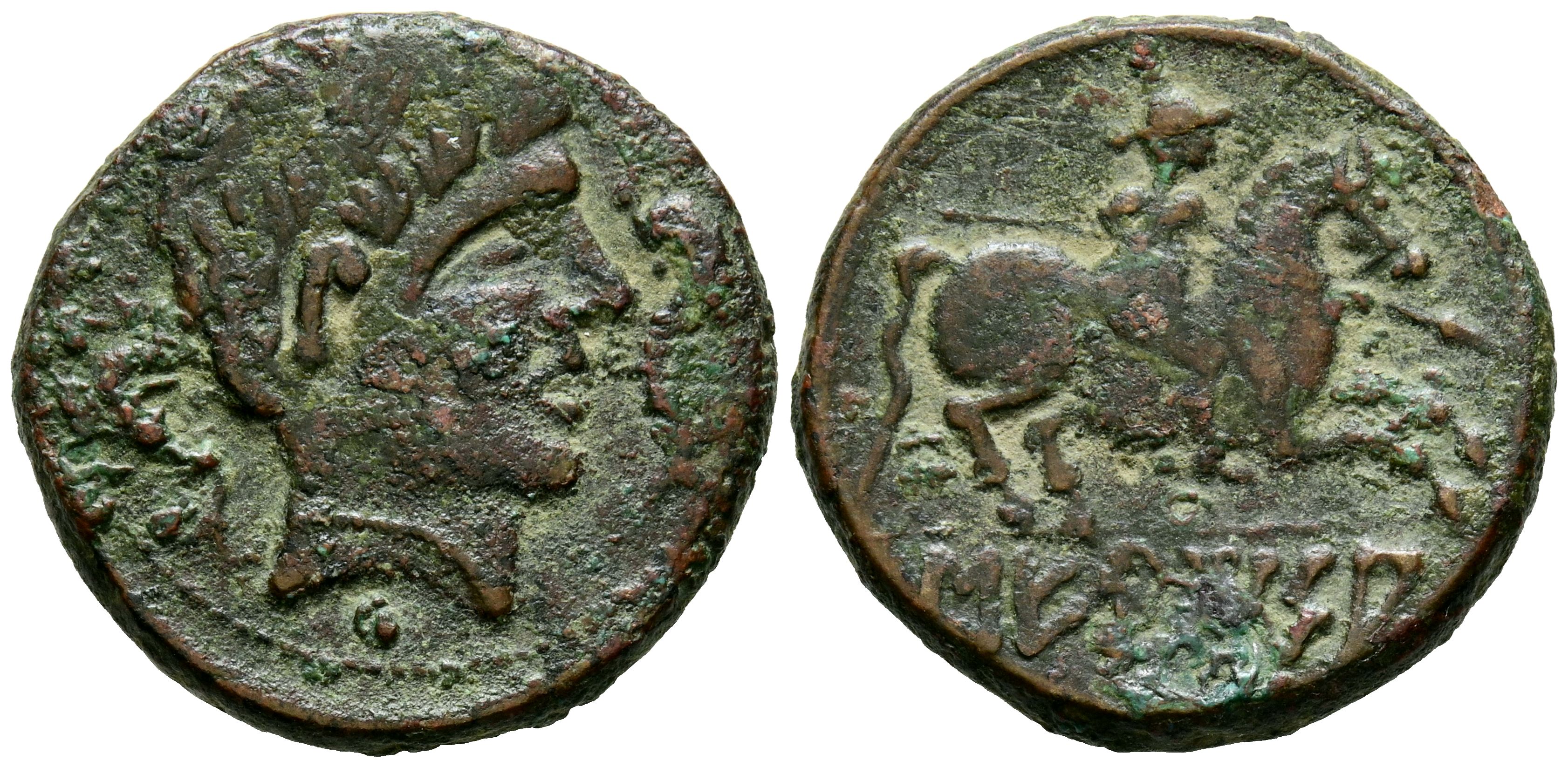 SECAISA (Segeda, Zaragoza). As. (Ae. 8,43g/24mm). 120-20 a.C. (FAB-2131var). Anv: Cabeza masculina a derecha con punto debajo y entre dos delfines. Rev: Jinete con lanza a derecha, debajo leyenda ibérica: SECaISA. MBC-.
