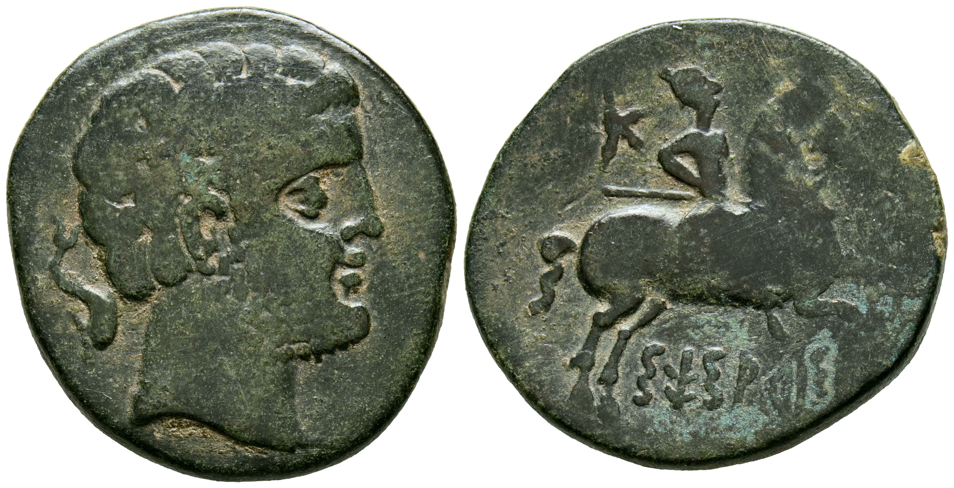 SESARS (Zona de Aragón). As. (Ae. 10,12g/26mm). 120-20 a.C. (FAB-2199). Anv: Cabeza masculina barbada a derecha, detrás delfín. Rev: Jinete con lanza a derecha, encima estrella, debajo leyenda ibérica: SESARS. MBC.