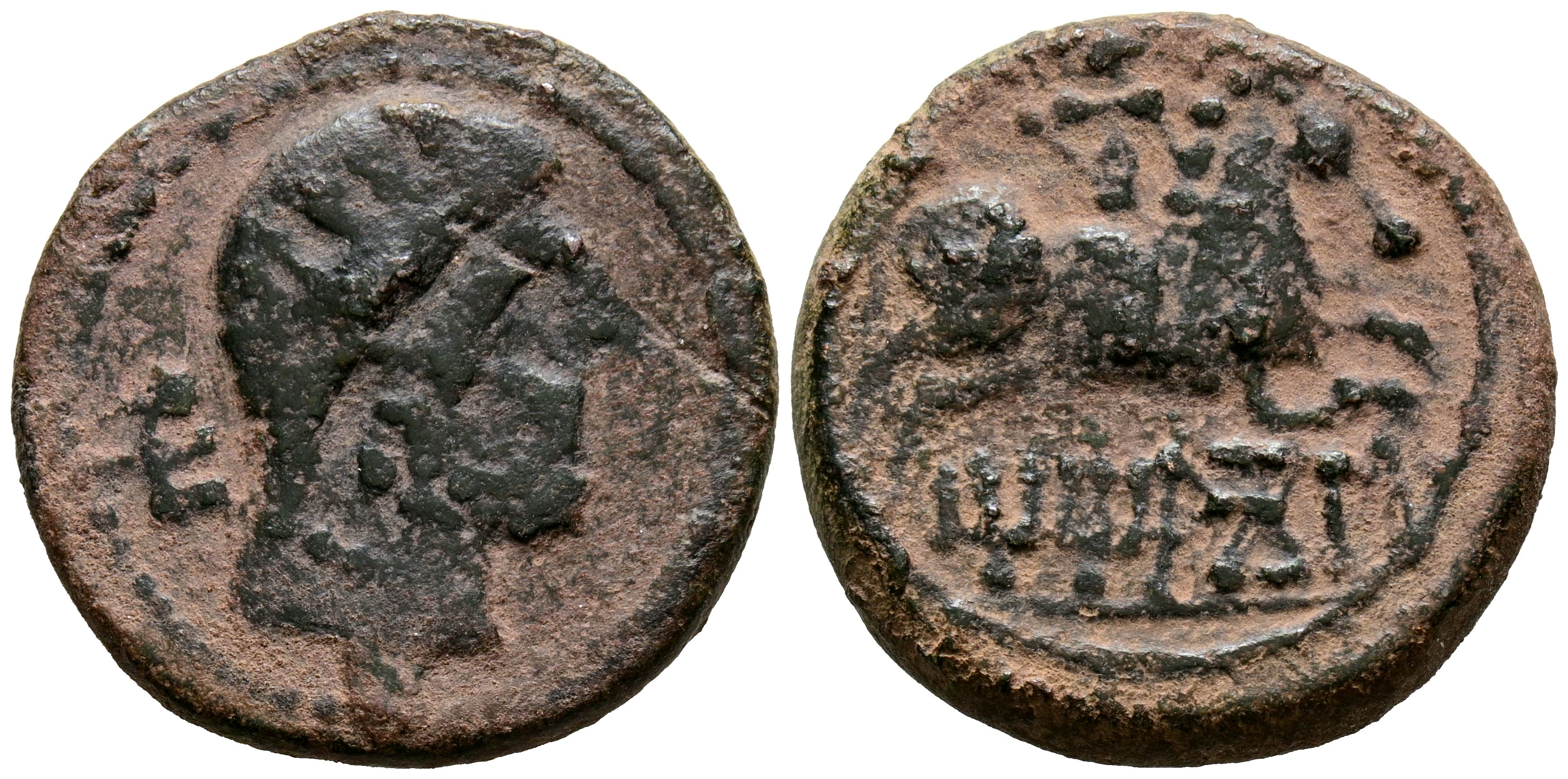 TITIACOS (Tricio, La Rioja). As. (Ae. 9,93g/24mm). 120-20 a.C. (FAB-2392). Anv: Cabeza masculina barbada a derecha, detrás letrá: Ti. Rev: Jinete con lanza a derecha, debajo leyenda ibérica: TiTiACoS. MBC-.