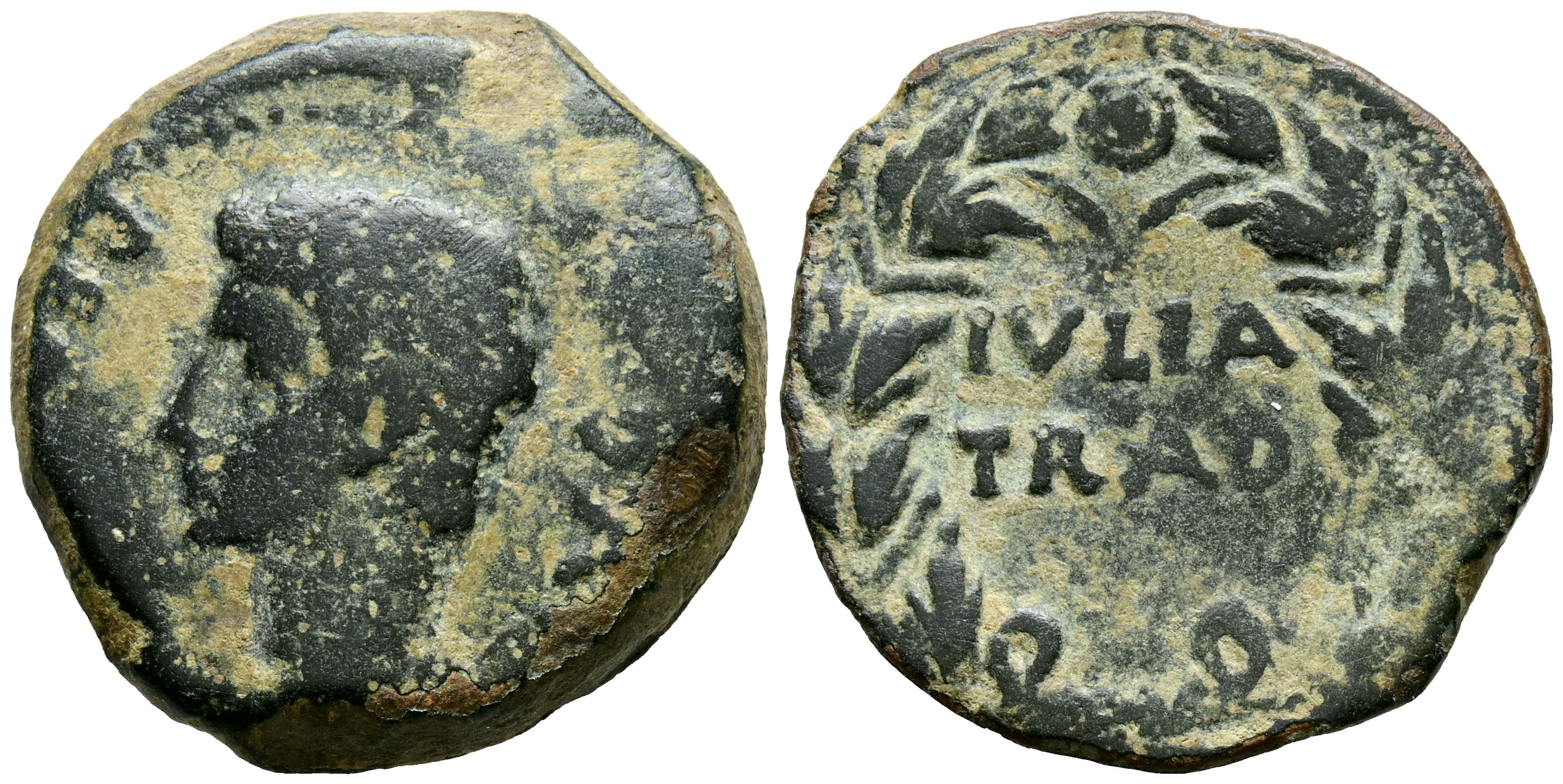 IULIA TRADUCTA (Algeciras, Cádiz). As. (Ae. 9,15g/26mm). 27 a.C.-14 d.C. (FAB-1614). Anv: Cabeza de Augusto a izquierda, alrededor leyenda: PERM CAES AVG. Rev: Leyenda: IVLIA/TRAD, dentro de corona de laurel. MBC.