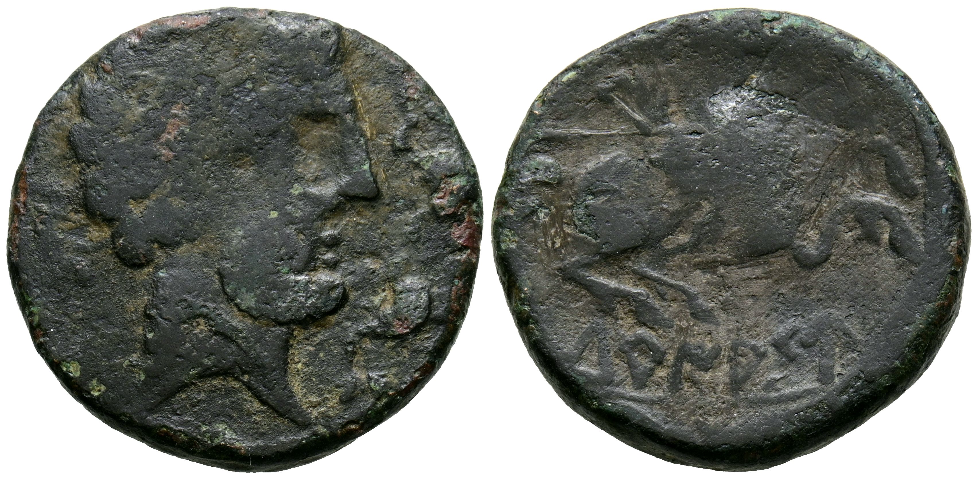 TURIASO (Tarazona, Zaragoza). As. (Ae. 8,57g/24mm). 120-20 a.C. (FAB-2428). Anv: Cabeza masculina barbada a derecha, alrededor tres delfines. Rev: Jinete con lanza a derecha, debajo leyenda ibérica: TuRIASU. MBC. Escaso ejemplar.