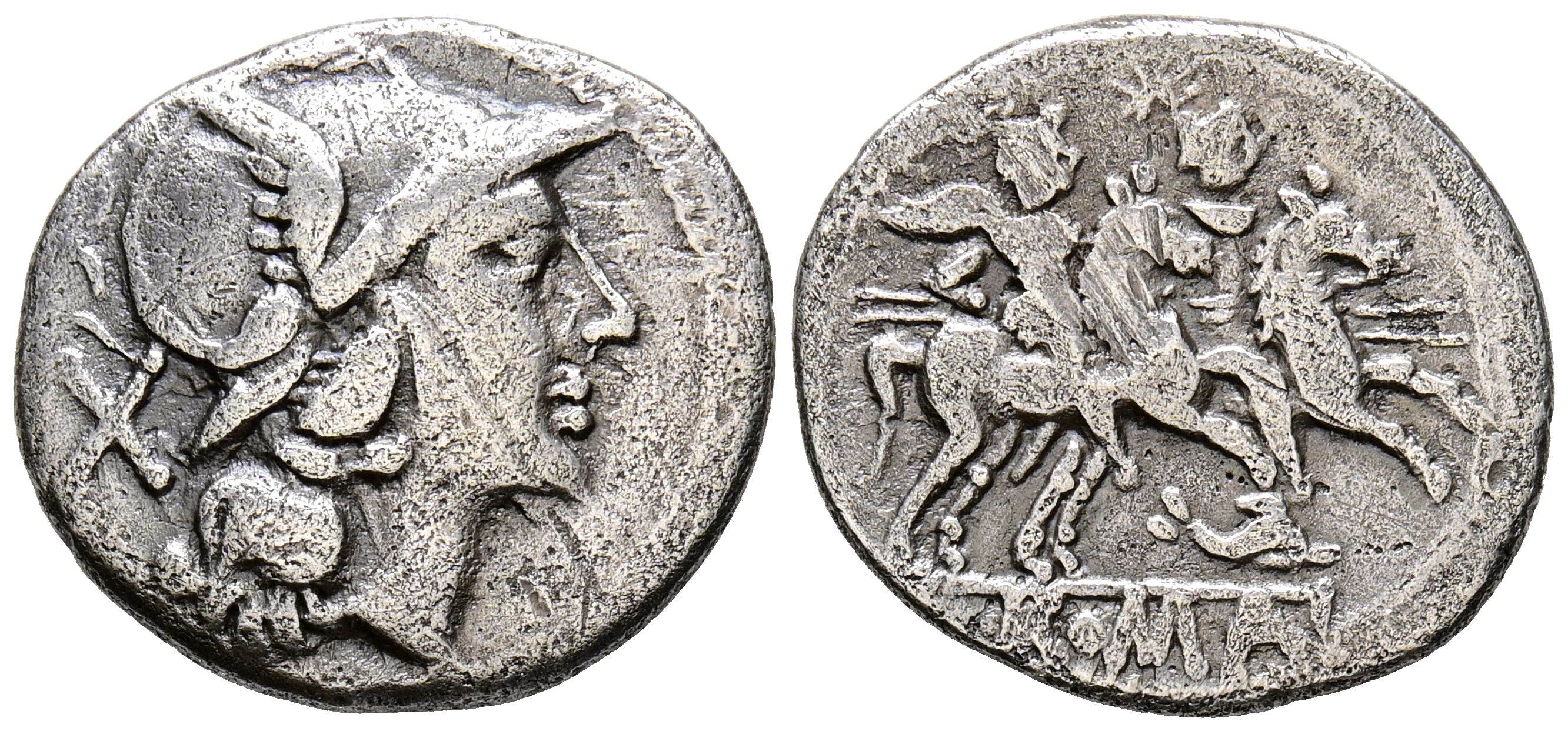 ACUÑACIONES ANONIMAS. Denario. (Ar. 3,22g/18mm). 209-208 a.C. Posiblemente acuñado en Sicilia. (FFC 31; Crawford 80/1a). Anv: Cabeza de Roma con casco a derecha, detrás: X. Rev: Dioscuros a caballo con lanzas a derecha, encima de ambos dos estrellas, debajo: delfín, en exergo: ROMA. MBC-. Escaso ejemplar.