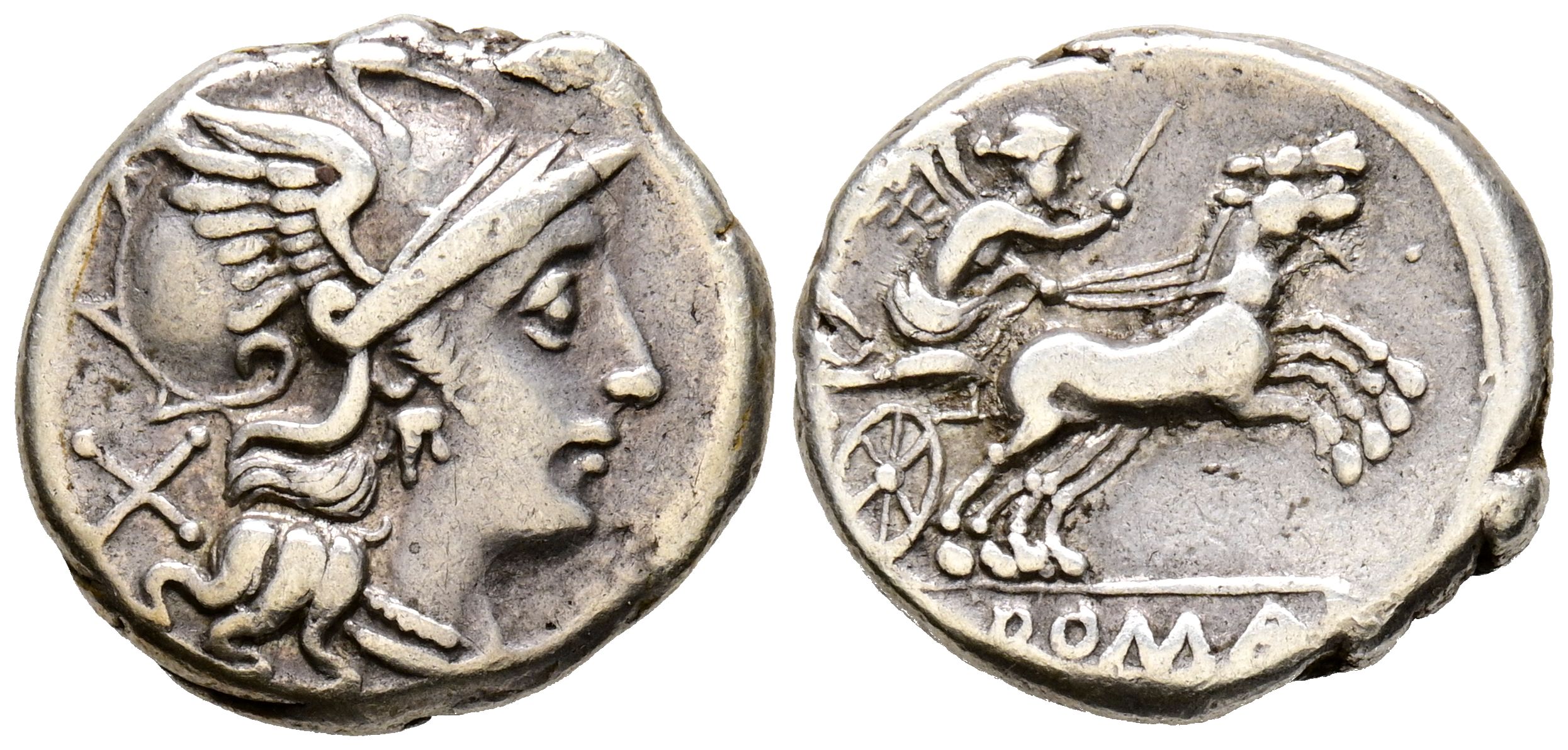 ACUÑACIONES ANONIMAS. Denario. (Ar. 4,07g/17mm). 157-156 a.C. Roma. (Crawford 197/1; FFC 77). Anv: Cabeza de Roma a derecha, detrás X. Rev: Victoria conduciendo biga a derecha con látigo en la mano, en exergo: ROMA. MBC.