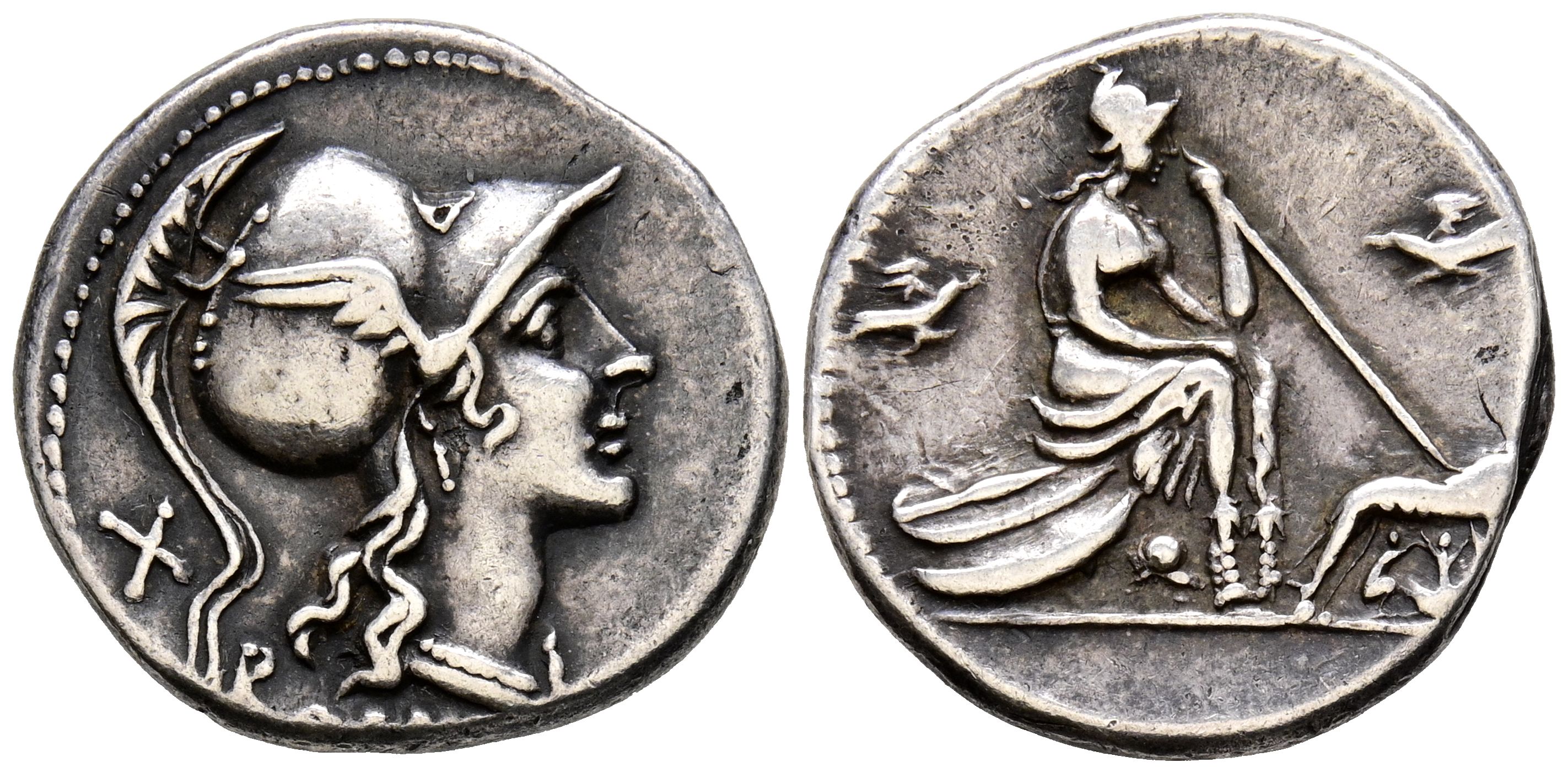 ACUÑACIONES ANONIMAS. Denario. (Ar. 3,92g/20mm). 115-114 a.c. Italia central. (FFC 83; Crawford 287/1). Anv: Cabeza de Roma a derecha, detrás X, debajo leyenda: ROMA. Rev: Roma con cetro sentada a derecha sobre escudos y casco, delante loba amamantando a Rómulo y Remo, encima dos pájaros. MBC+. Atractivo ejemplar.