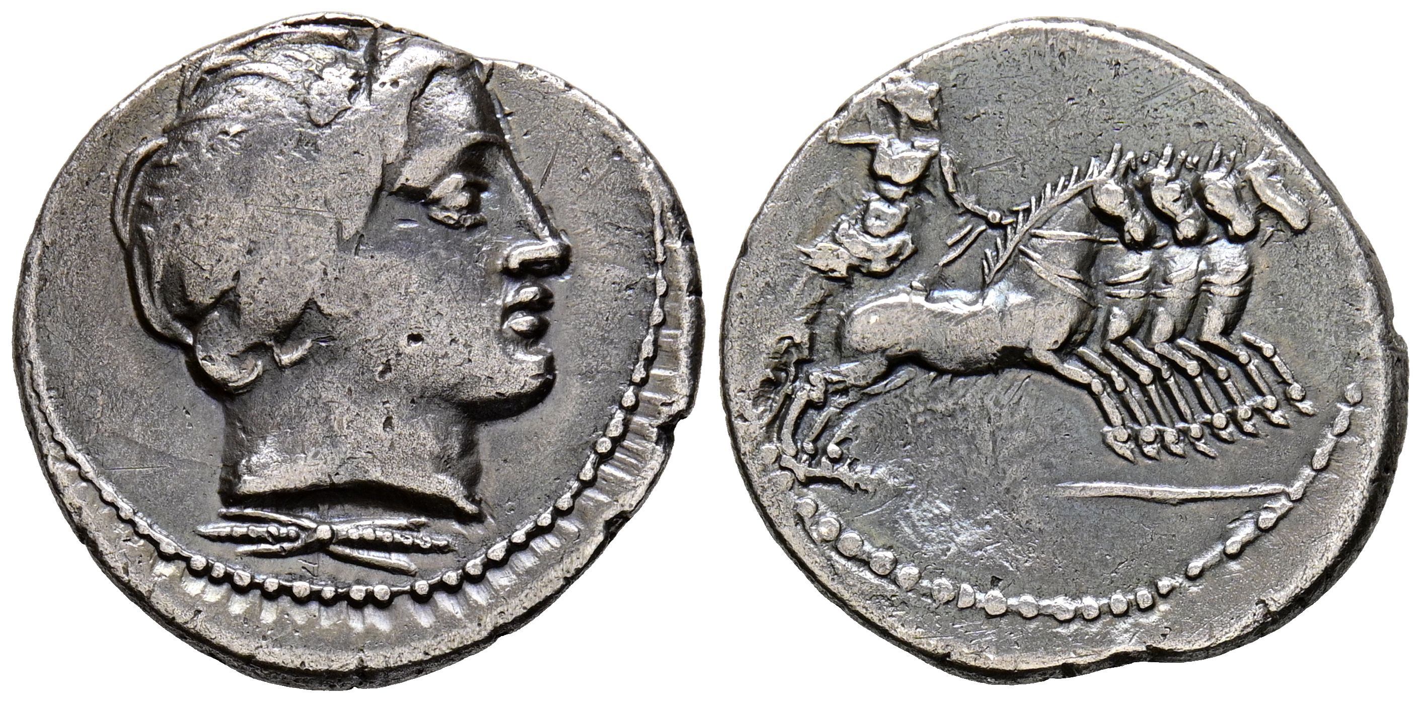 ACUÑACIONES ANONIMAS. Denario. (Ar. 3,29g/20mm). 86 a.C. Roma. (FFC 85; Crawford 350/A2). Anv: Cabeza laureada de Apolo a derecha, debajo haz de rayos. Rev: Júpiter con haz de rayos conduciendo cuádriga a derecha. MBC. Golpe en reverso.