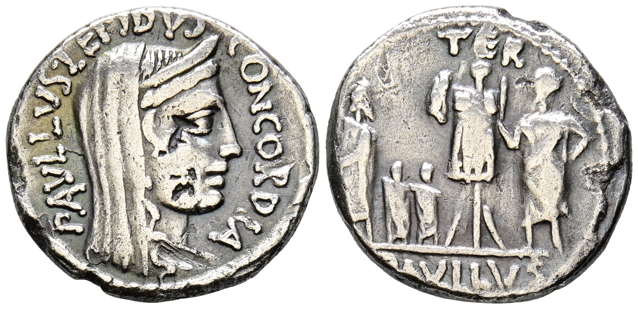 GENS AEMILIA. Denario. (Ar. 3,77g/18mm). 62 a.C. Roma. (FFC 126; Crawford 415/1). Anv: Cabeza velada y diademada de Concordia a derecha, alrededor leyenda: PAVLLVS LEPIDVS CONCORDIA. Rev: L Aemilius Lepidus estante a izquierda, apoyándose sobre trofeo, delante Perseo de Macedonia estante a derecha junto a sus hijos, encima leyenda: TER, en exergo: PAVLLVS. MBC.