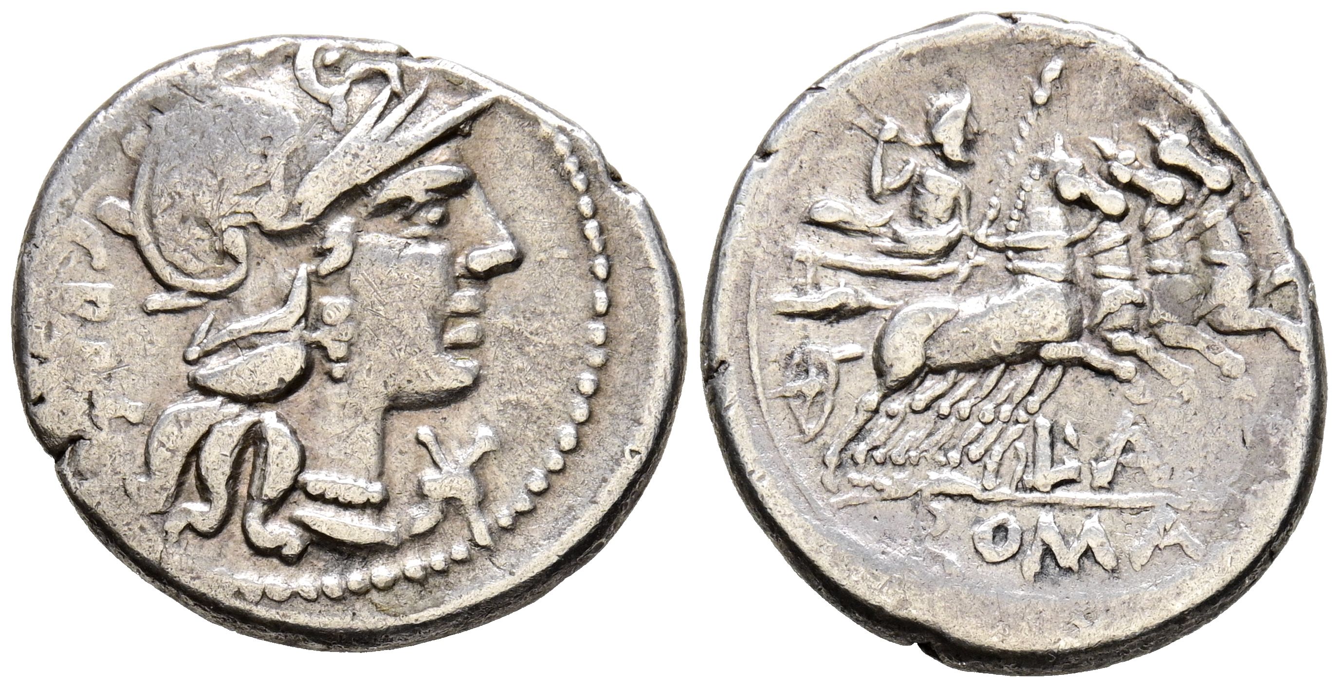 GENS ANTESTIA. Denario. (Ar. 3,77g/20mm). 136 a.C. Roma. (FFC 151; Crawford 238/1). Anv: Cabeza de Roma a derecha, detrás leyenda: GRAG, delante estrella. Rev: Júpiter en cuádriga a derecha con cetro y haz de rayos, debajo leyenda: L ANTES, en exergo: ROMA. MBC.