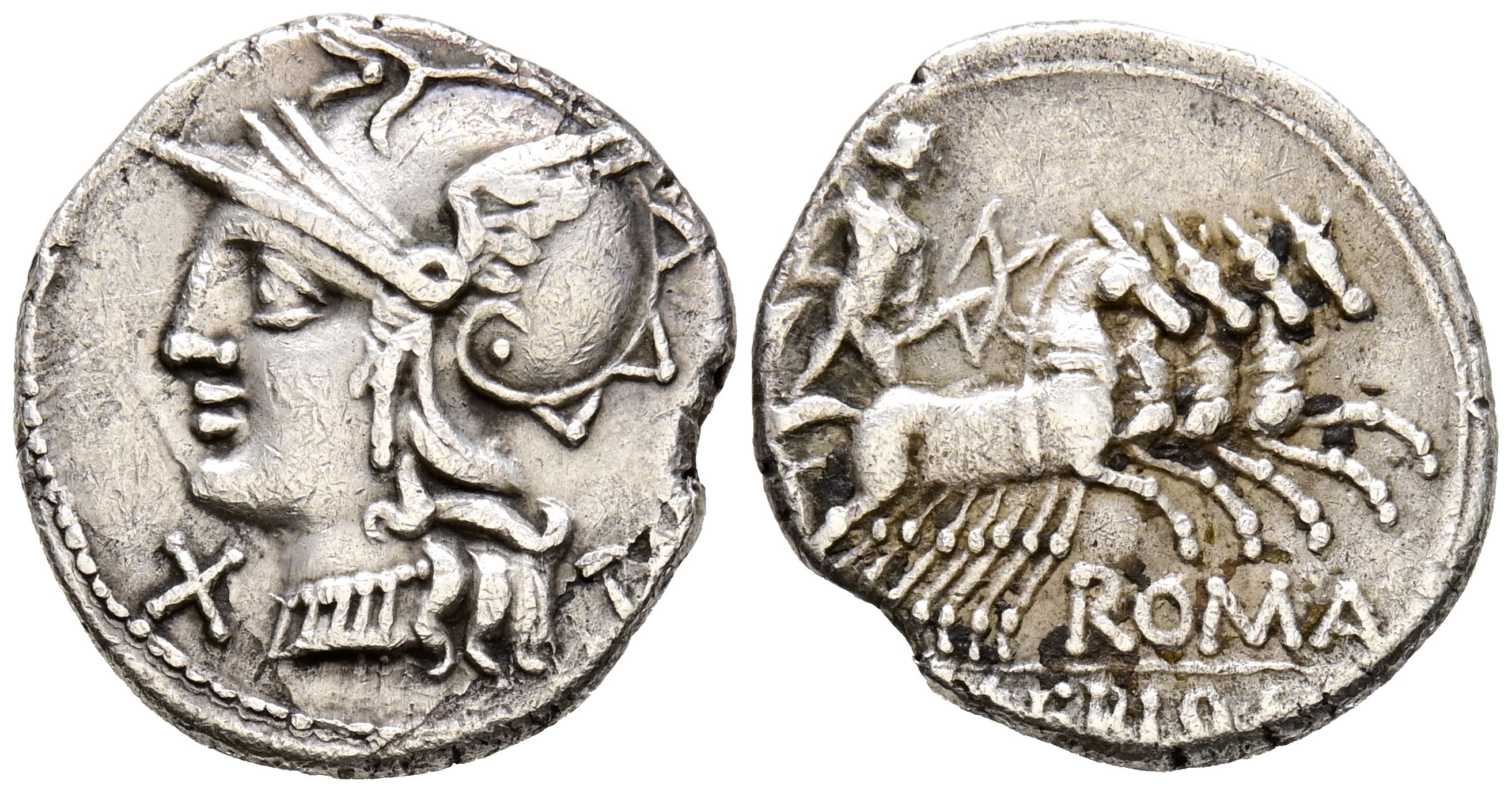 GENS BAEBIA. Denario. (Ar. 3,12g/19mm). 137 a.C. Roma. (FFC 198; Crawford 236/1a). Anv: Cabeza de Roma a izquierda, delante X, detrás leyenda: TAMPIL. Rev: Apolo con palma, arco y flechas conduciendo cuádriga a derecha, debajo leyenda: ROMA, en exergo: M BAEBI QF. MBC-.