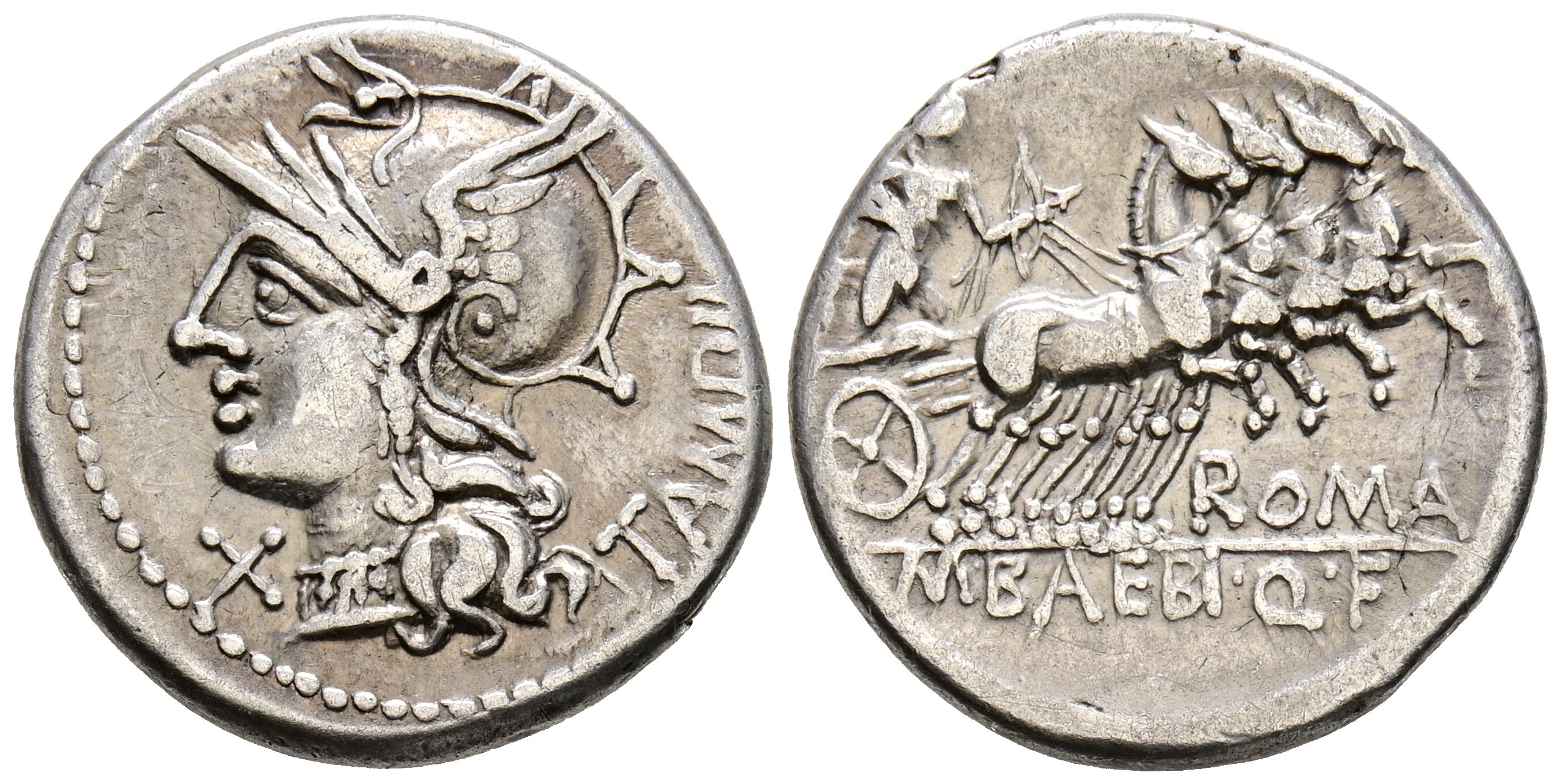 GENS BAEBIA. Denario. (Ar. 3,91g/19mm). 137 a.C. Roma. (FFC 199; Crawford 236/1a). Anv: Cabeza de Roma a izquierda con collar, delante X, detrás leyenda: TAMPIL. Rev: Apolo con palma, arco y flechas conduciendo cuádriga a derecha, debajo leyenda: ROMA, en exergo: M BAEBI QF. MBC+.