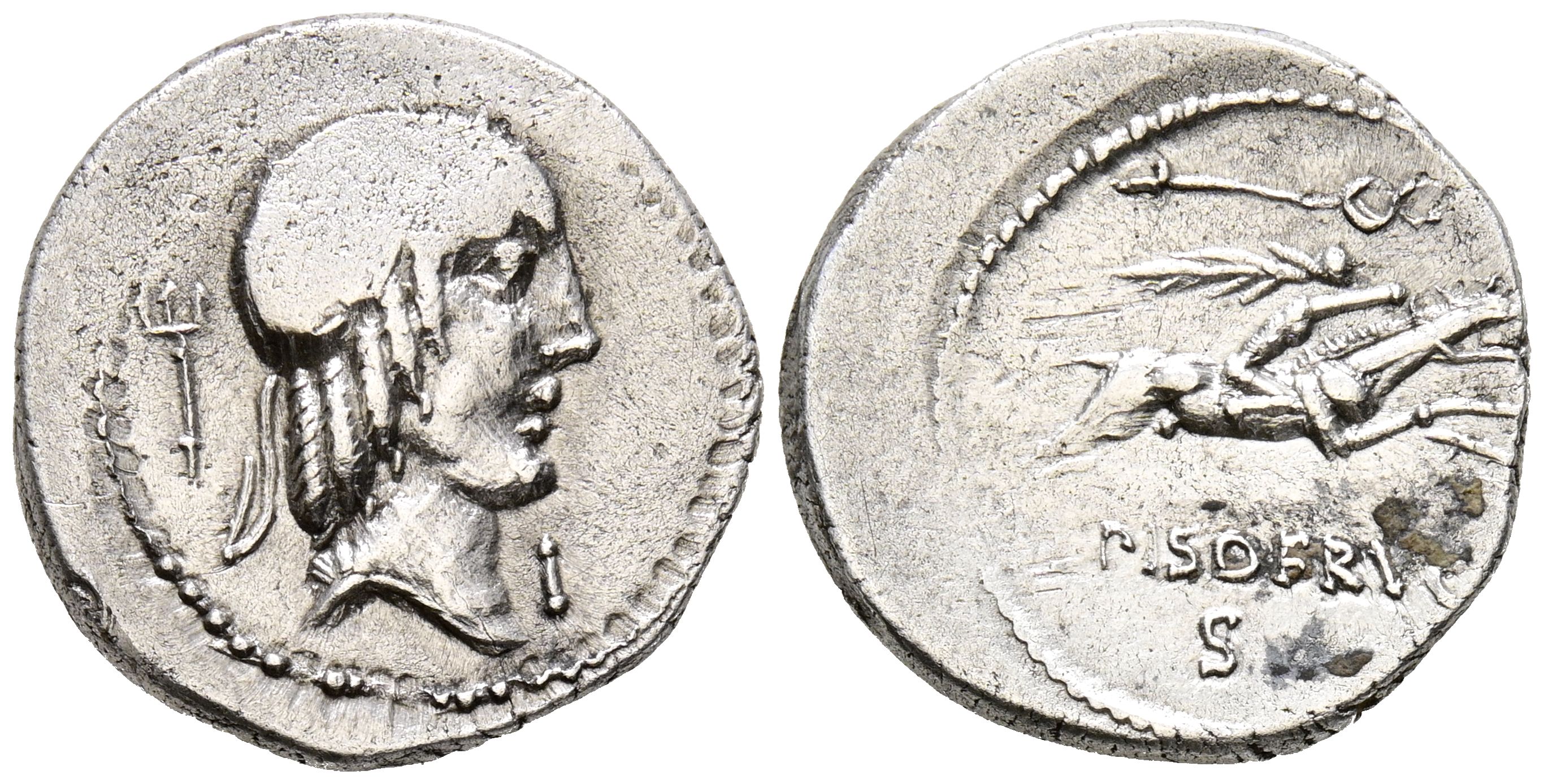GENS CALPURNIA. Denario. (Ar. 3,89g/19mm). 90-89 a.C. Roma. (Crawford 340/1). Anv: Cabeza de Apolo a derecha, detrás tridente hacia arriba y delante valor I. Rev: Jinete con palma galopando a derecha, encima caduceo, debajo leyenda: L PISO FRVGI/S. MBC.