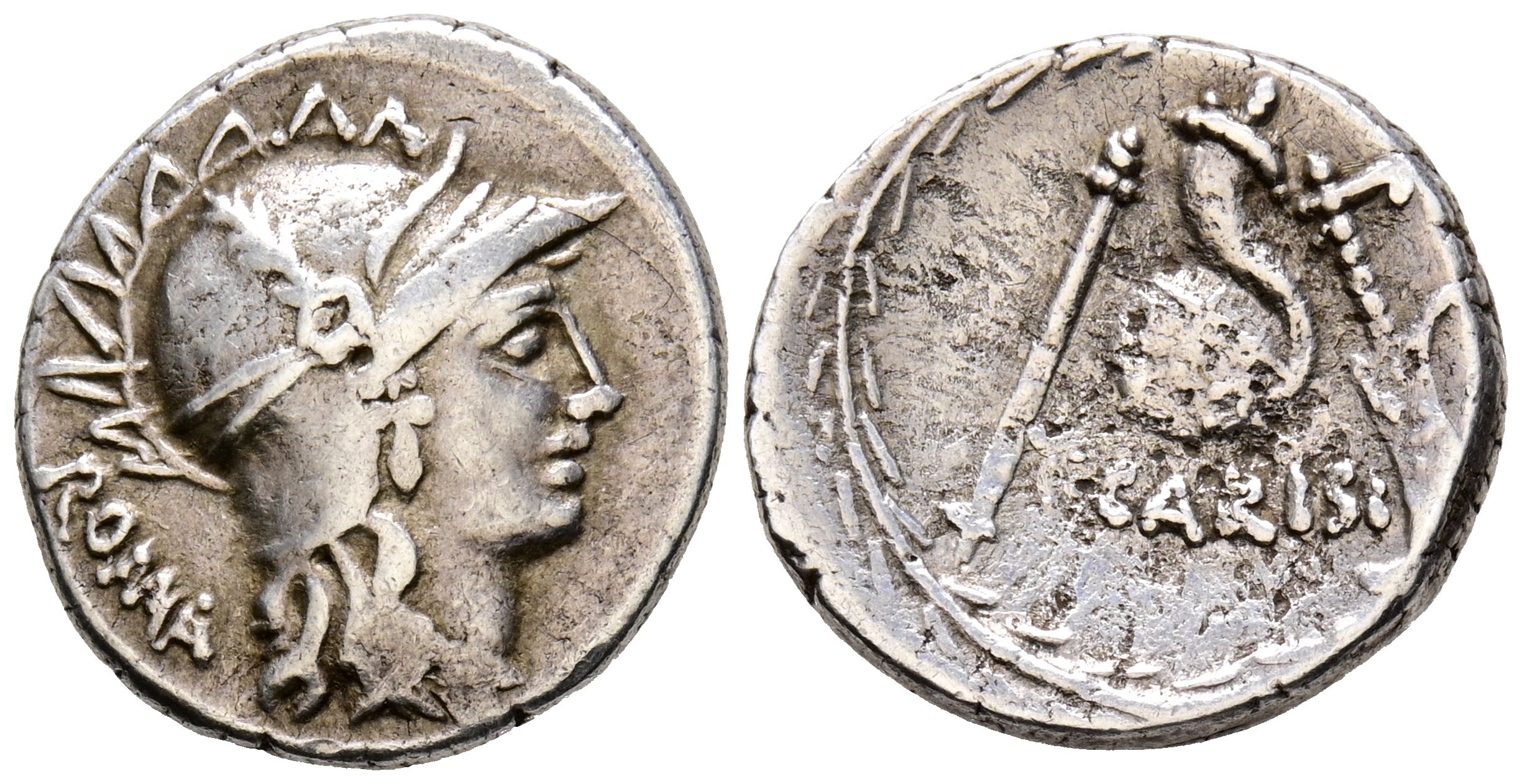 GENS CARISIA. Denario. (Ar. 3,36g/18mm). 46 a.C. Roma. (FFC 546; Crawford 464/3a). Anv: Cabeza de Roma a derecha, detrás leyenda: ROMA. Rev: Cornucopia sobre globo entre cetro y tmón, debajo leyenda: T CARISI, todo dentro de corona de laurel. MBC-.