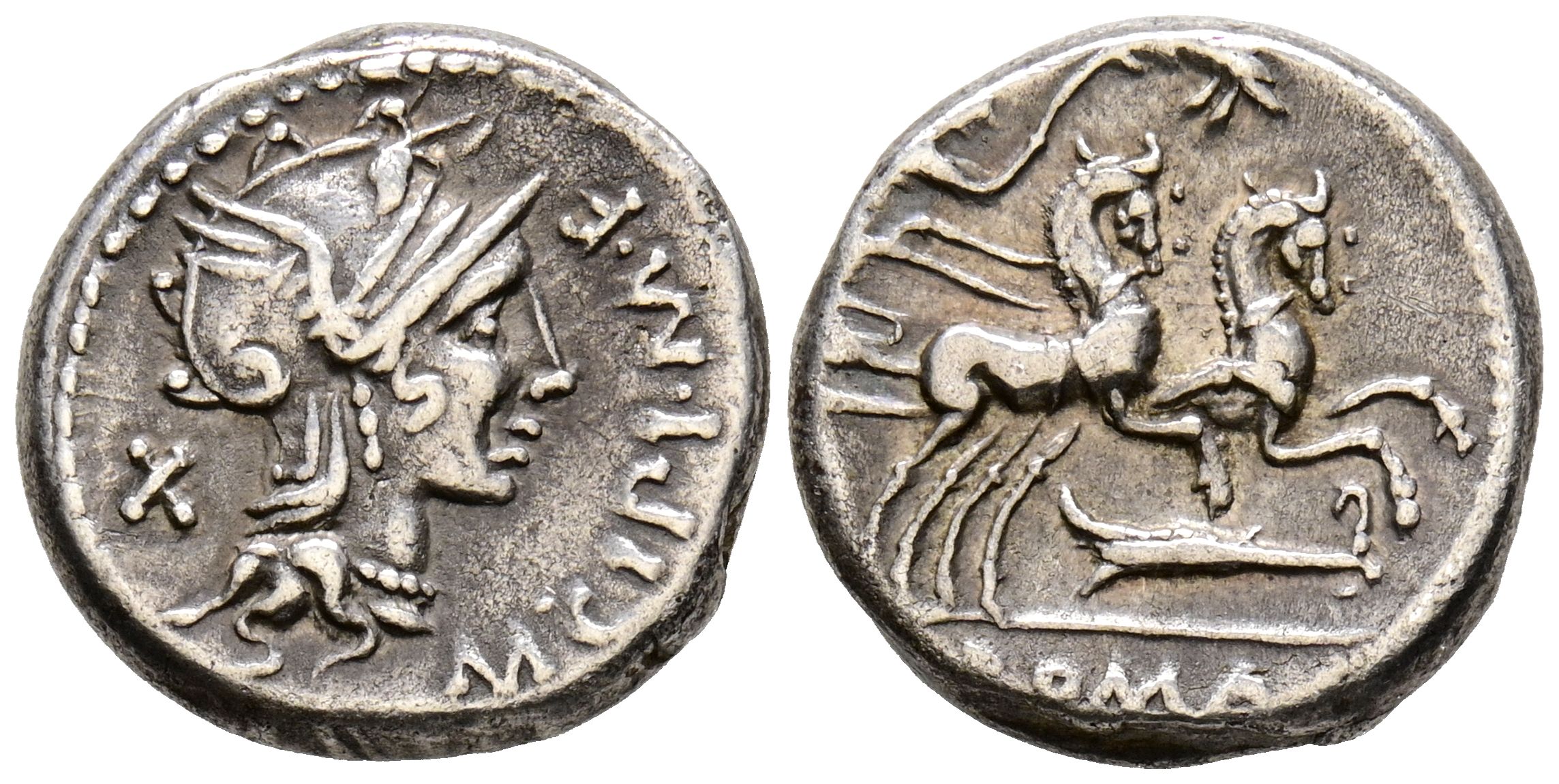GENS CIPIA. Denario. (Ar. 3,88g/16mm). 115-114 a.C. Ceca incierta. (FFC 563; Crawford 289/1). Anv: Cabeza de roma a derecha, delante leyenda: M CIPI M F, detrás X. Rev: Victoria con palma en viga a derecha, debajo timón, en exergo: ROMA. MBC.