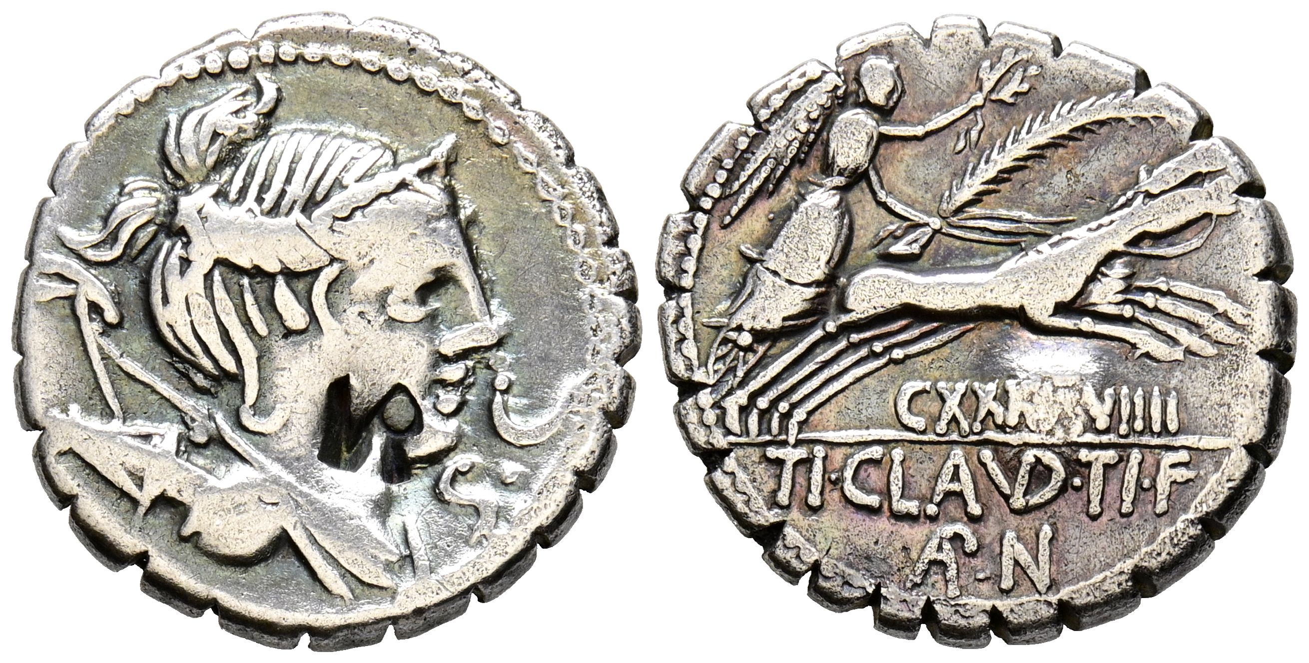 GENS CLAUDIA. Denario. (Ar. 3,97g/18mm). 79 a.C. Taller auxiliar de Roma. (FFC 567; Crawford 381/1a). Anv: Busto diademado de Diana a derecha portando carcaj y arco sobre espalda, delante SC. Rev: Victoria con corona de laurel y palma conduciendo biga a derecha, debajo: LXXXII, en exergo: TI CLAVD TI F/AP N. MBC. Contramarca en anverso.