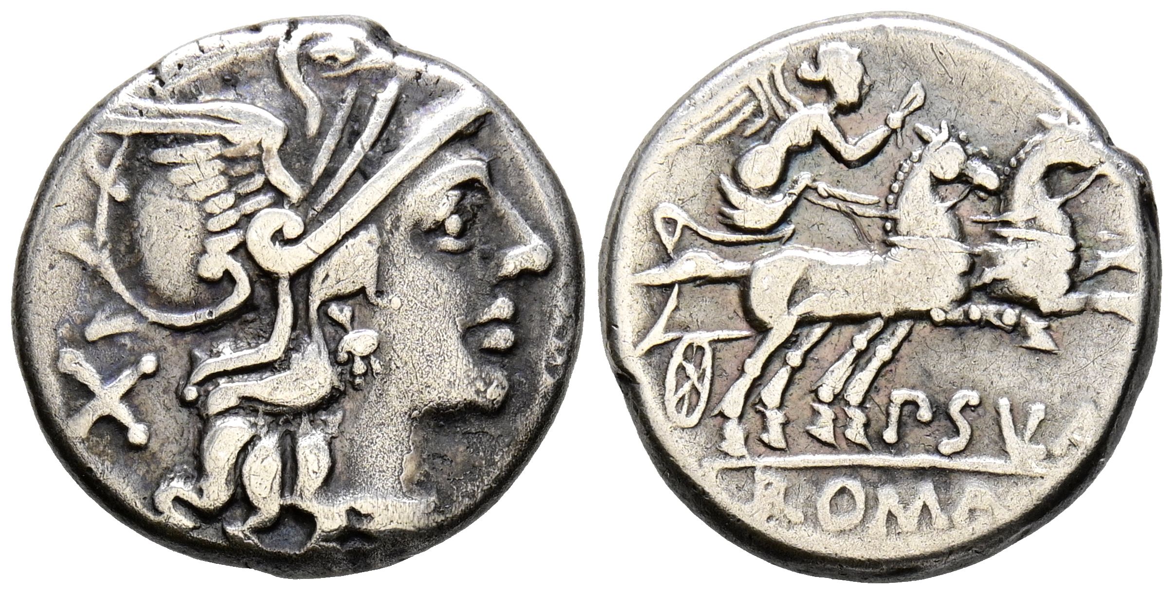 GENS CORNELIA. Denario. (Ar. 3,68g/17mm). 151 a.C. Roma. (FFC 607; Crawford 205/1). Anv: Cabeza de Roma a derecha, detrás X. Rev: Victoria con látigo en biga a derecha, debajo leyenda: P SVLA, en exergo: ROMA. MBC.