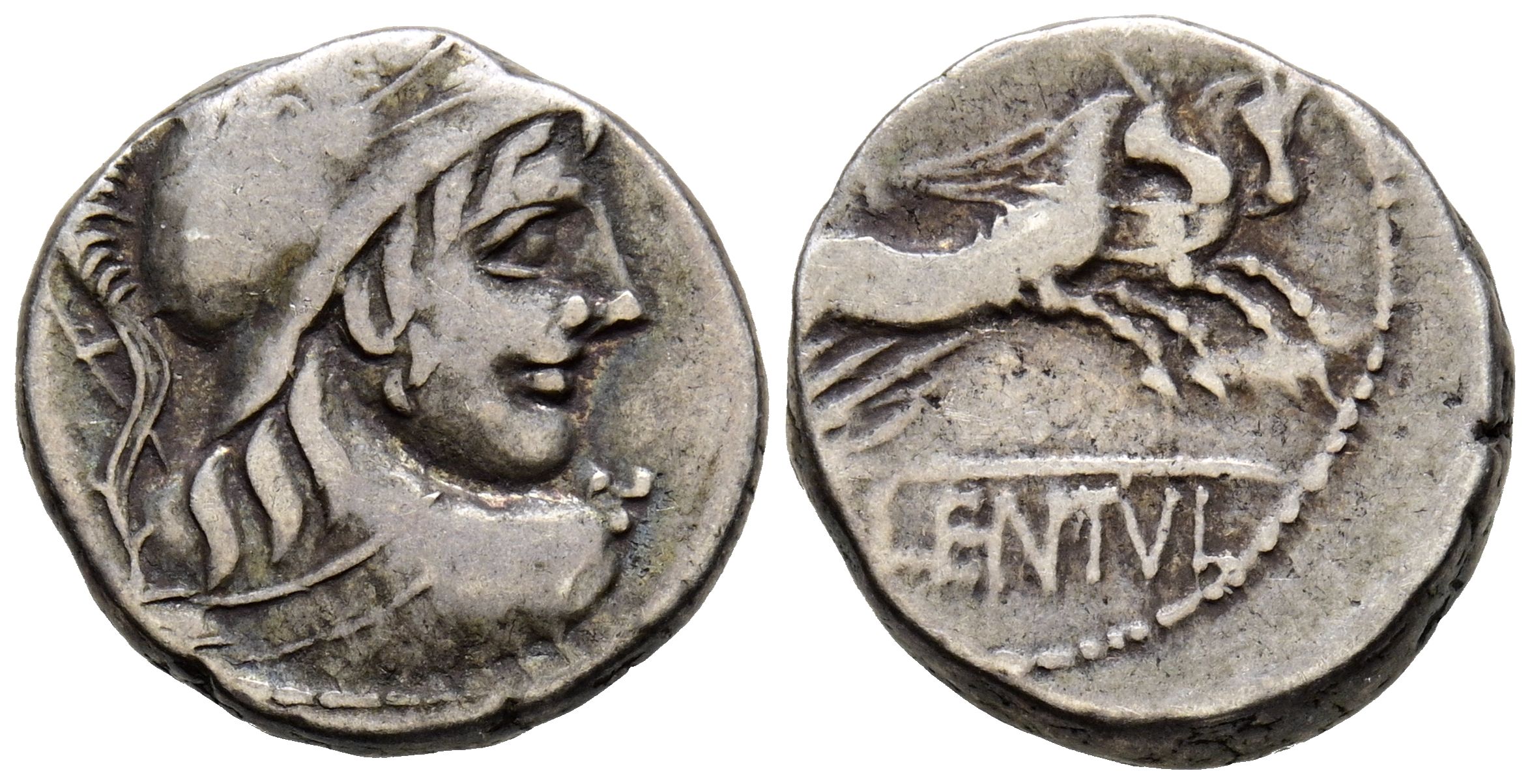 GENS CORNELIA. Denario. (Ar. 4,13g/17mm). 88 a.C. Roma. (FFC 624; Crawford 345/1). Anv: Busto de marte a derecha visto por la espalda, con lanza sobre el hombro. Rev: Victoria con corona conduciendo biga a derecha, en exergo: CN LENTVL. MBC.