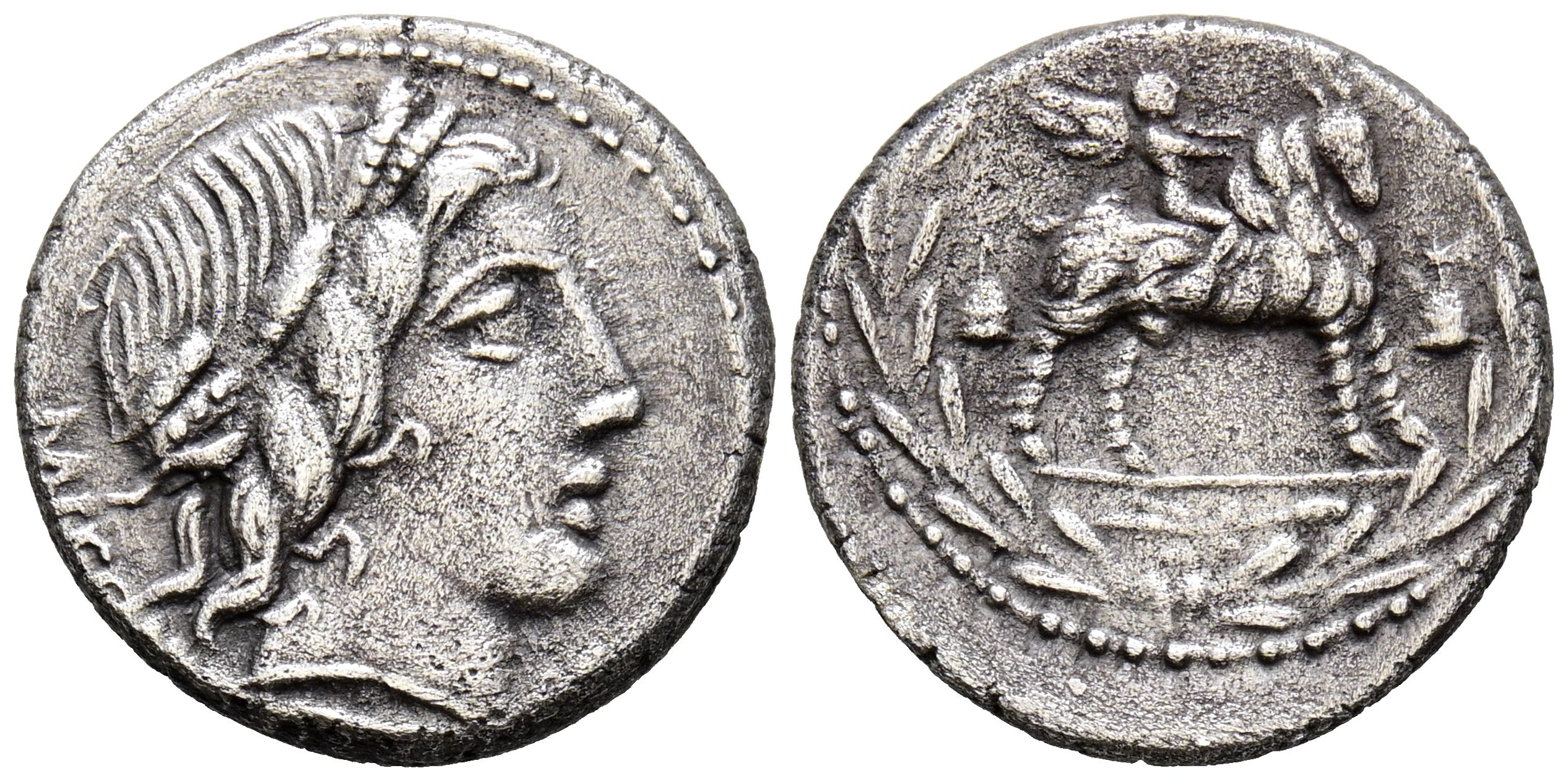 GENS FONTEIA. Denario. (Ar. 3,84g/17mm). 85 a.C. Sur de Italia. (FFC 721; Crawford 353/1d). Anv: Cabeza laureada de Apolo a derecha, debajo haz de rayos, delante leyenda: C F, detrás leyenda: MN FONTEI. Rev: Genio sobre cabra a derecha, encima gorros de Dioscuros, debajo tirso, todo dentro de corona de laurel. MBC-.