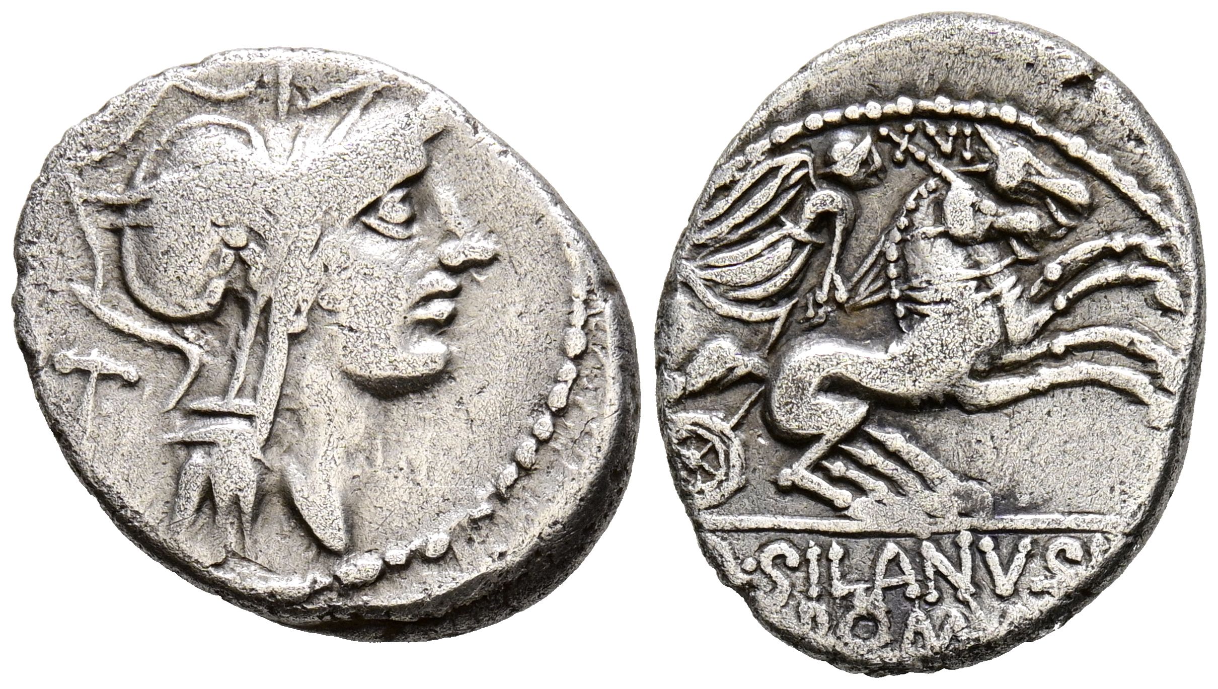 GENS JUNIA. Denario. (Ar. 3,58g/19mm). 91 a.C. Roma. (FFC 791; Crawford 337/3). Anv: Cabeza de Roma con casco a derecha, detrás: T. Rev: Victoria conduciendo biga a derecha, encima: XVI, en exergo: D SILANVS L/ROMA. MBC-.