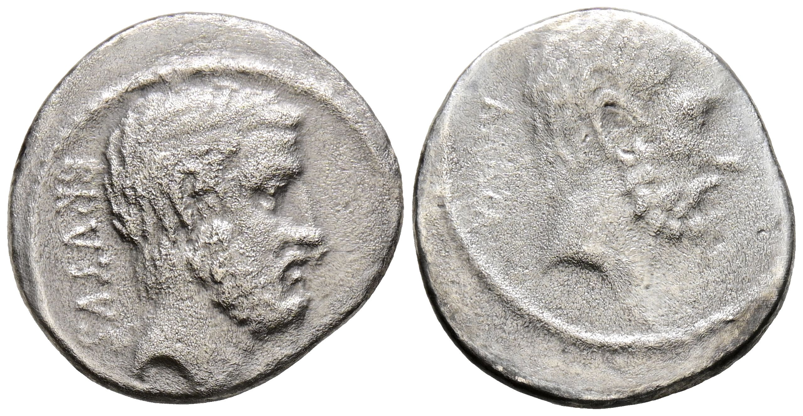 GENS JUNIA. Denario. (Ar. 3,23g/18mm). 54 a.C. Roma. (FFC 792; Crawford 433.2). Anv: Cabeza de Junius Brutus el Anciano a derecha, detrás leyenda: BRVTVS. Rev: Cabeza de Servilius Ahala a derecha, detrás leyenda: AHALA. BC. Descentrado. Oxidaciones.