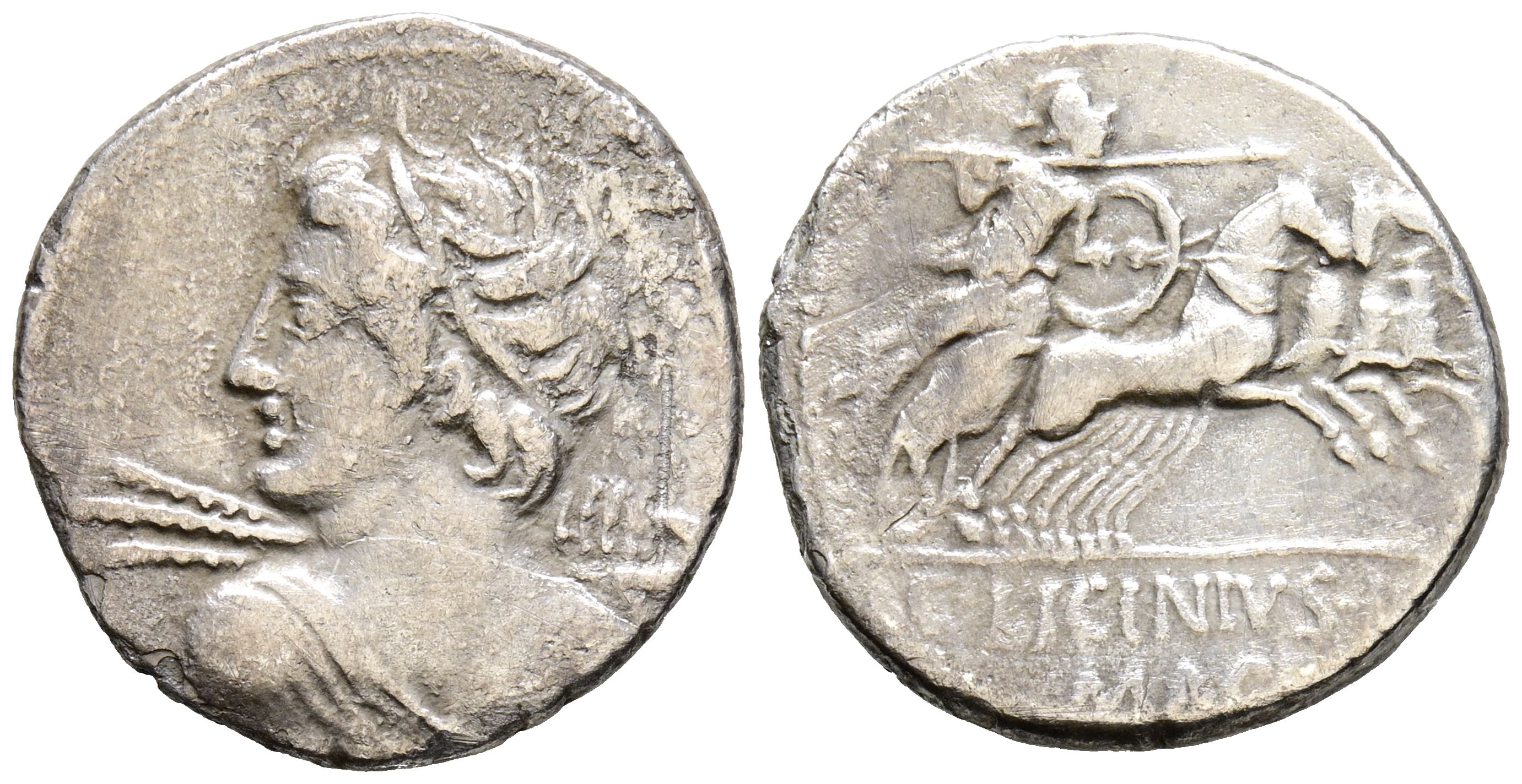 GENS LICINIA. Denario. (Ar. 3,77g/20mm). 84 a.C. Taller auxiliar de Roma. (FFC 803; Crawford 354/1). Anv: Busto diademado de Apolo a izquierda con haz de rayos en la mano. Rev: Minerva en cuádriga con lanza y escudo a derecha, en exergo: C LICINIVS LF/MACER. MBC.