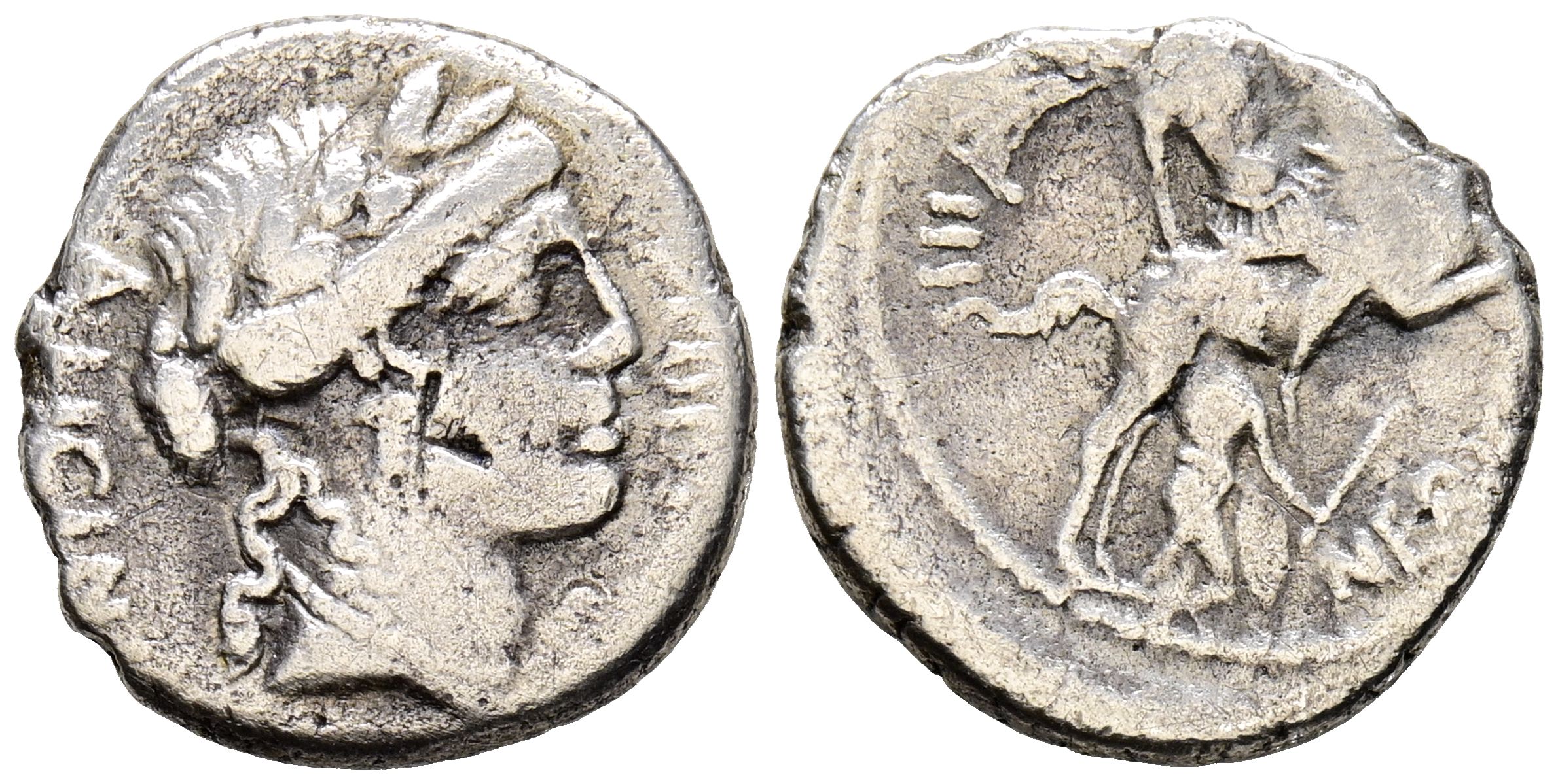 GENS LICINIA. Denario. (Ar. 2,91g/17mm). 47 a.C. Roma. (FFC 809; Crawford 454/2). Anv: Cabeza laureada de Fides a derecha, delante leyenda: FIDES, detrás: A LICINIVS. Rev: Jinete a derecha cogiendo a cautivo de los pelos, encima: III VIR, debajo: NERVA. MBC-.