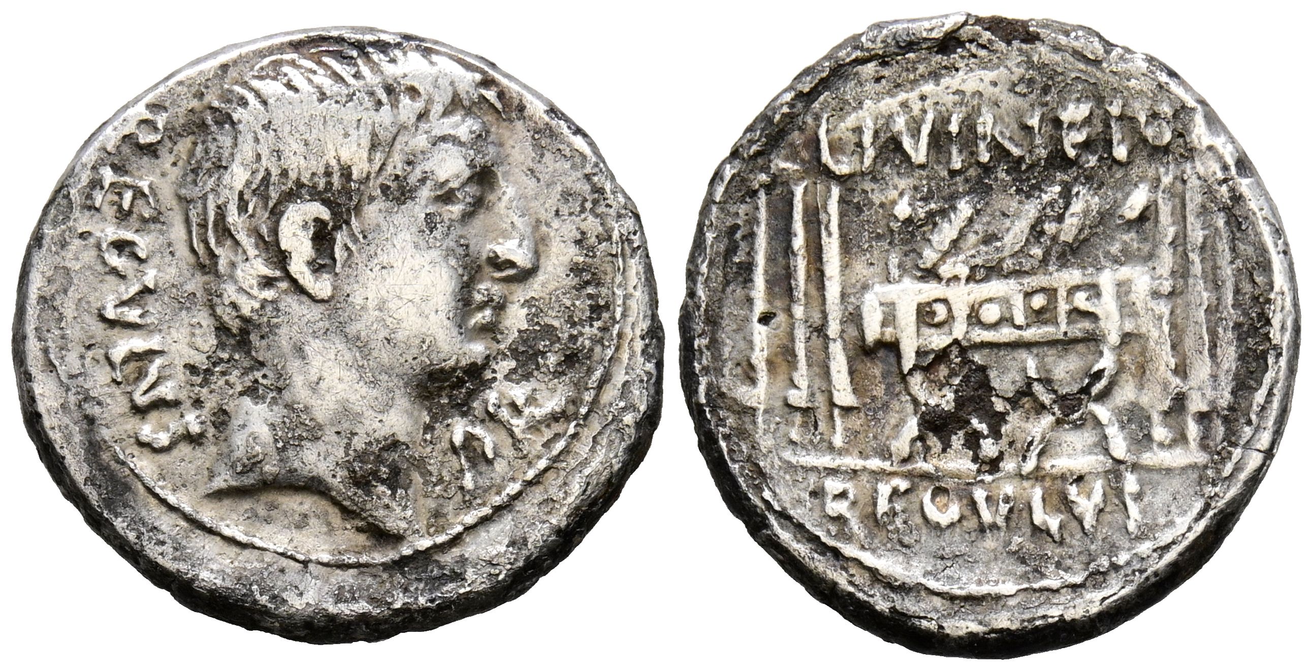 GENS LIVINEIA. Denario forrado. (Ar. 3,07g/18 mm). 42 a.C. Roma. (FFC 812; Crawford 494/27). Anv: Cabeza de Lucio Livineius a la derecha, alrededor de la leyenda: REGVLVS PR. Rev: Silla curul entre seis fasces, alrededor de la leyenda: L LIVINEIVS REGVLVS. MBC-.
