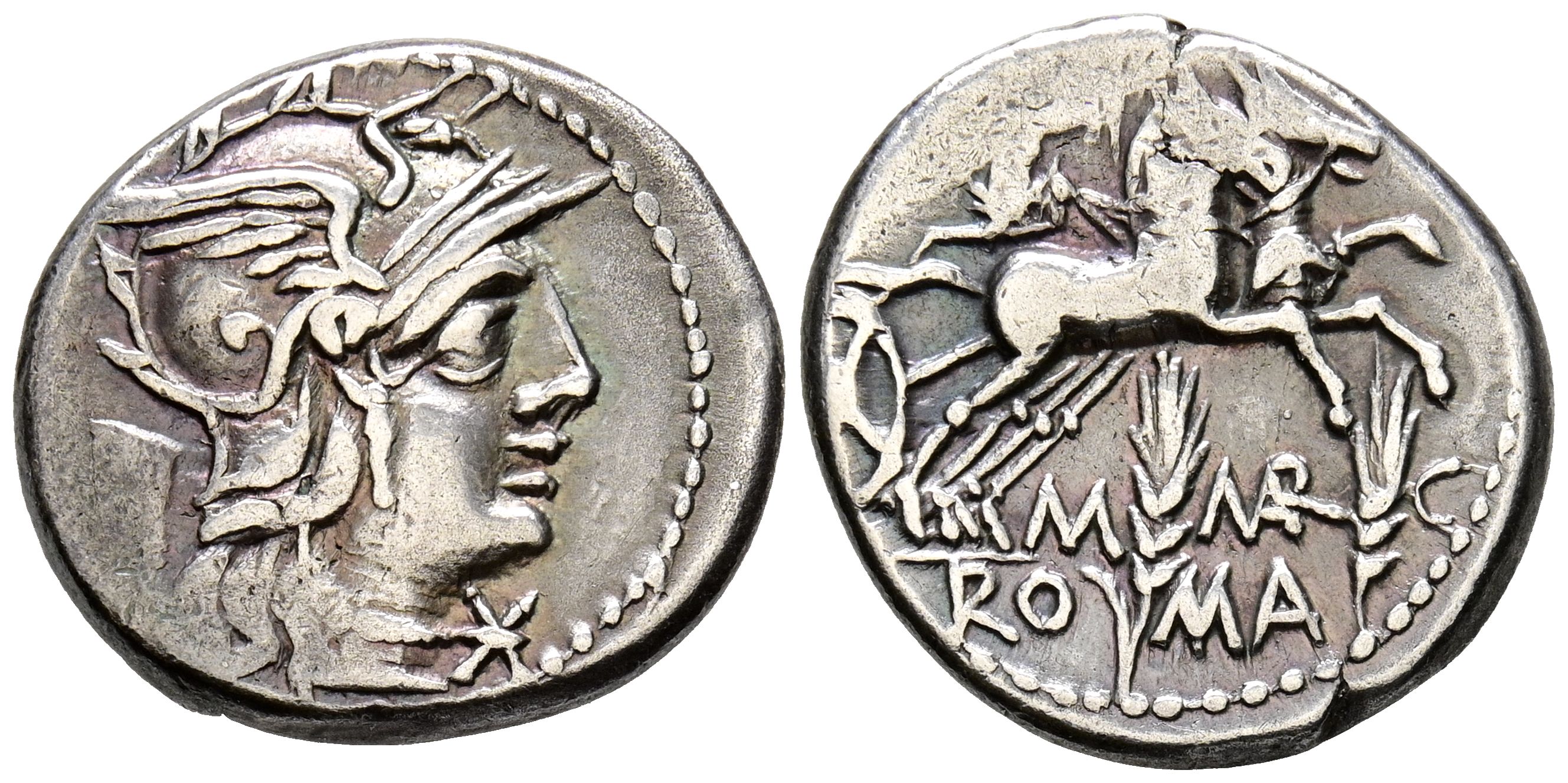 GENS MARCIA. Denario. (Ar. 3,89g/19mm). 134 a.C. Roma. (FFC 850; Crawford 245/1). Anv: Cabeza de Roma a derecha, delante estrella, detrás modio. Rev: Victoria con látigo conduciendo biga a derecha, debajo dos espigas con leyenda entre ellas: M MAR C/ROMA. MBC.
