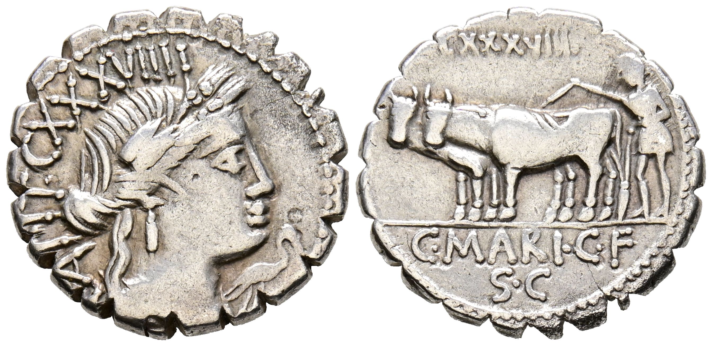 GENS MARIA. Denario. (Ar. 3,60g/19mm). 81 a.C. Taller auxiliar de Roma. (Crawford 378/1c; FFC 901). Anv: Cabeza laureada de Ceres a derecha, encima: CXXXVIIII, detrás leyenda: CAPIT, delante pájaro. Rev: Colono conduciendo dos bueyes a izquierda, encima: CXXXVIIII, debajo leyenda: C MARI CF/SC. MBC.