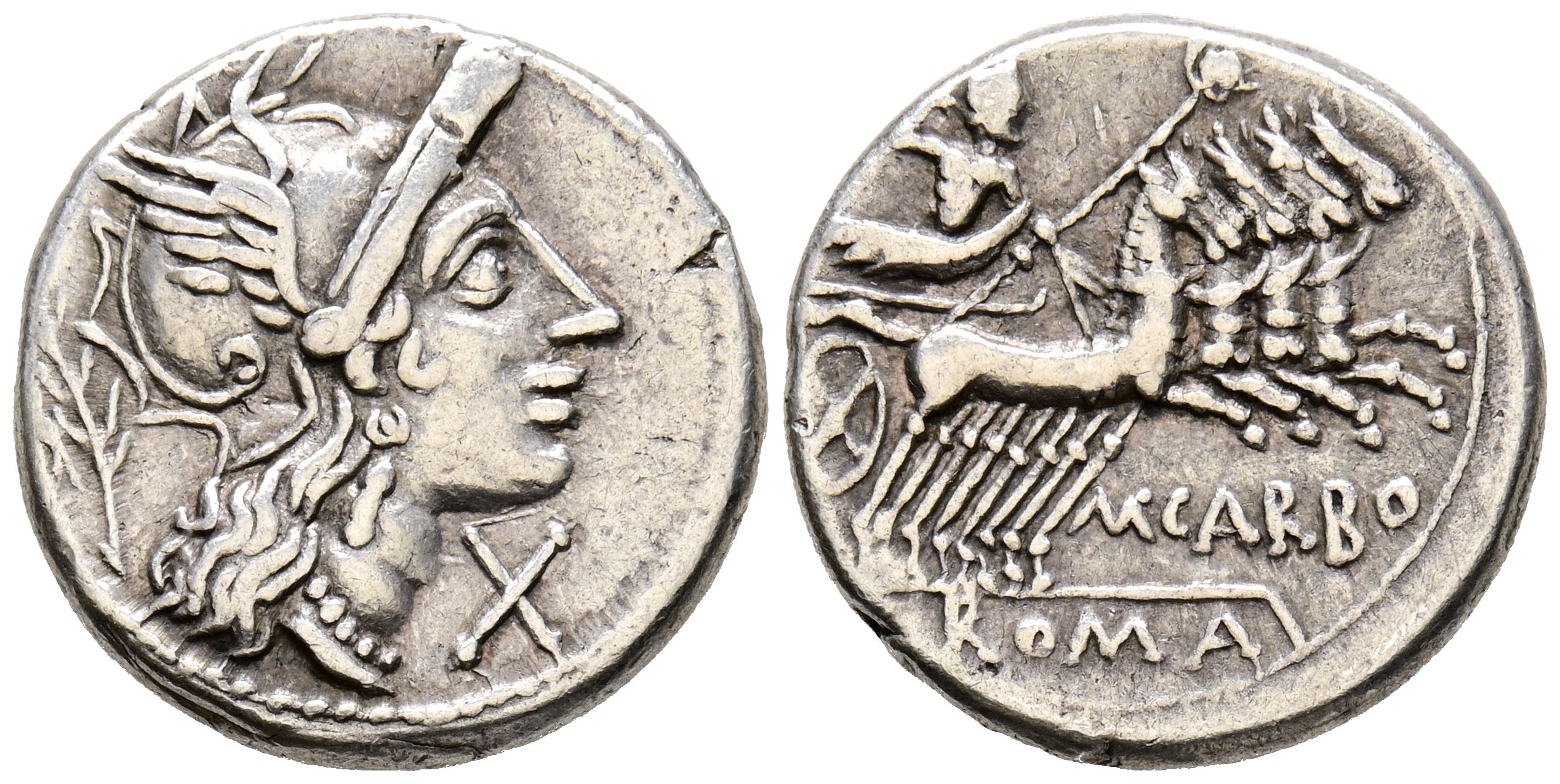 GENS PAPIRIA. Denario. (Ar. 3,86g/18mm). 121 a.C. Taller auxiliar de Roma. (FFC 959; Crawford 276/1). Anv: Cabeza de Roma con casco a derecha, delante X, detrás rama de laurel. Rev: Júpiter con cetro y rayos conduciendo cuádriga a derecha, debajo leyenda: M CARBO, en exergo: ROMA. MBC.