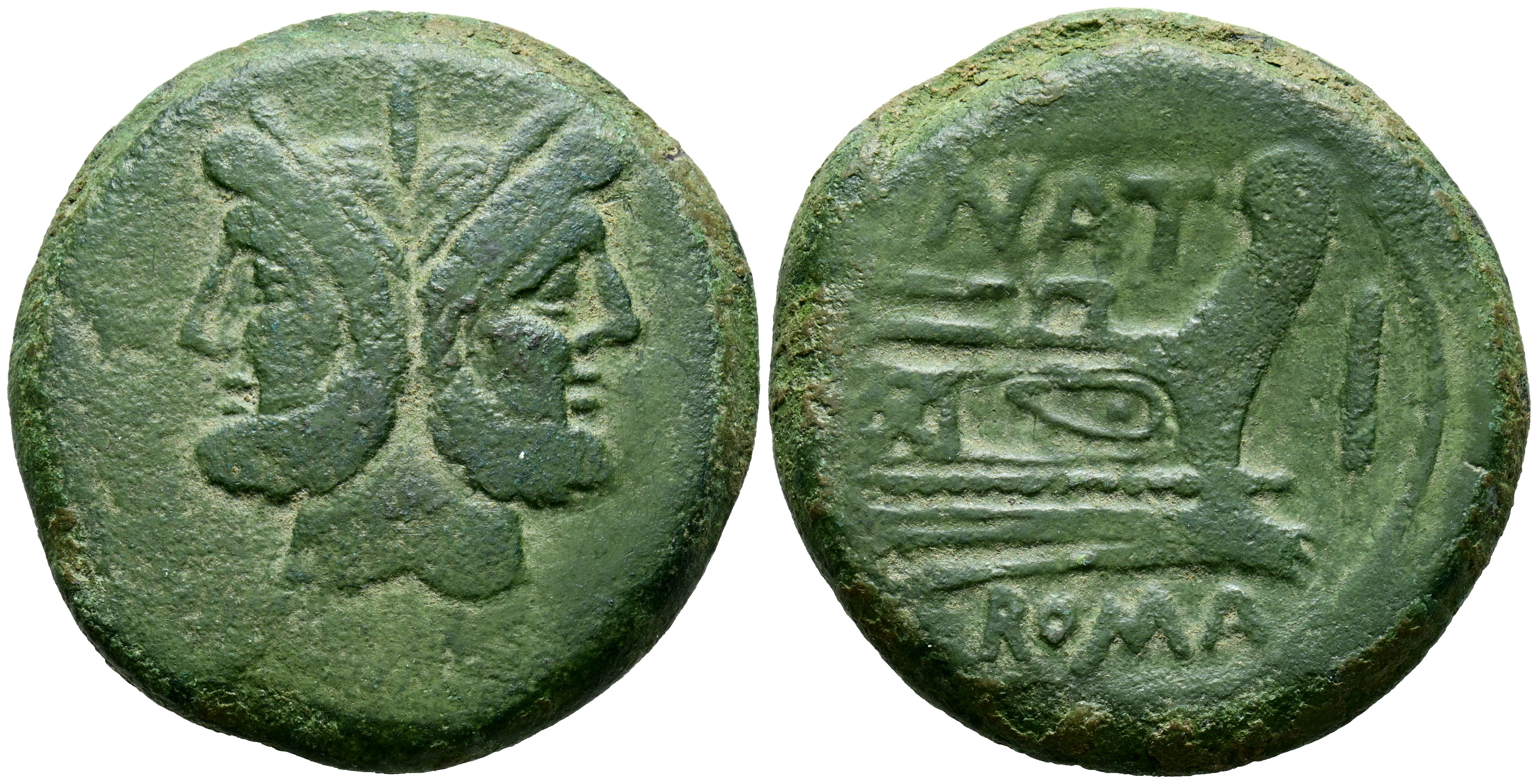 GENS PINARIA. As. (Ae. 34,11g/35mm). 155 a.C. Roma. (Crawford 200/2). Anv: Cabeza de Jano de dos caras, arriba I. Rev: Reverencia a la derecha, encima de la leyenda: NAT, debajo de la leyenda: ROMA, delante I. MBC. Atractiva pátina verde.
