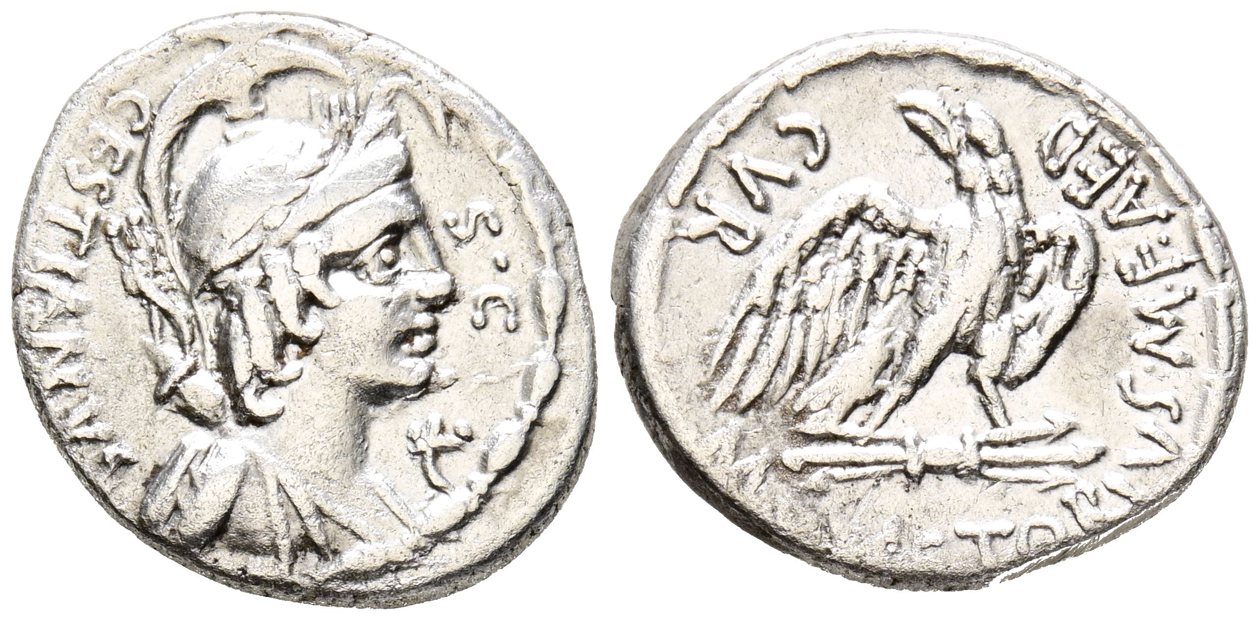 GENS PLAETORIA. Denario. (Ar. 3,77g/18mm). 67 a.C. Roma. (FFC 969; Crawford 409/1). Anv: Busto con casco de la diosa Vacuna a derecha, delante cornucopia, detrás arco con carcaj, alrededor leyenda: CESTIANVS SC. Rev: Aguila estante sobre rayo a derecha mirando a izquierda, alrededor leyenda: M PLAETORIVS MF AED CVR. MBC.